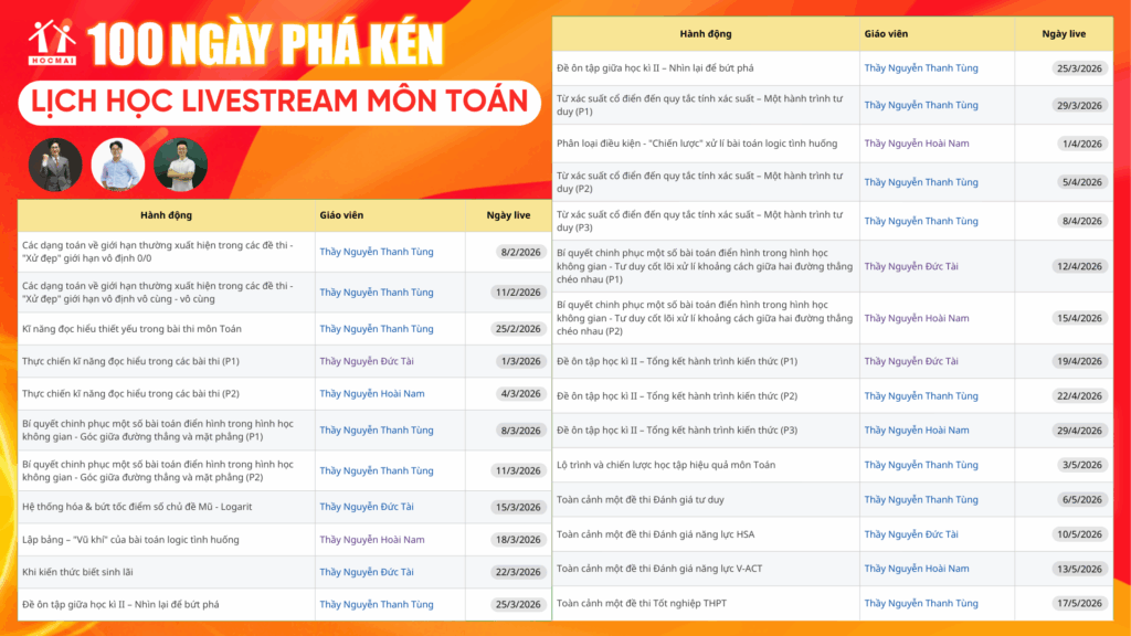 Lịch học livestream 100 ngày phá kén – Môn Toán