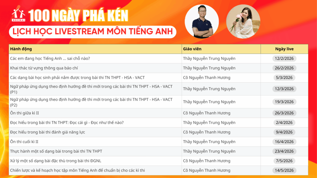 Lịch học livestream 100 ngày phá kén – Môn Tiếng Anh