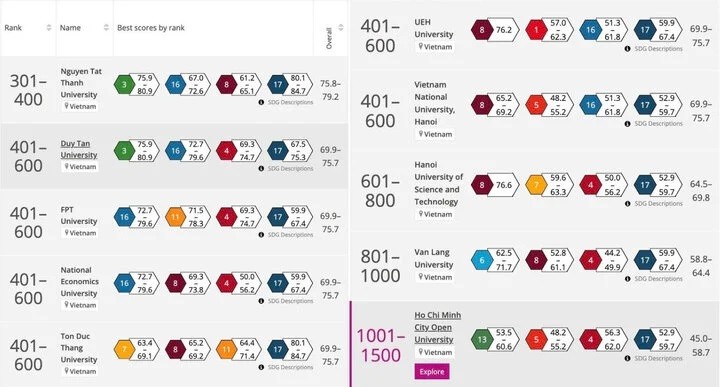 Đại học Nguyễn Tất Thành có thứ hạng cao nhất Việt Nam, xếp trong nhóm 301-400. Đây cũng là lần đầu tiên trường này góp mặt trong bảng xếp hạng Impact Ranking.
