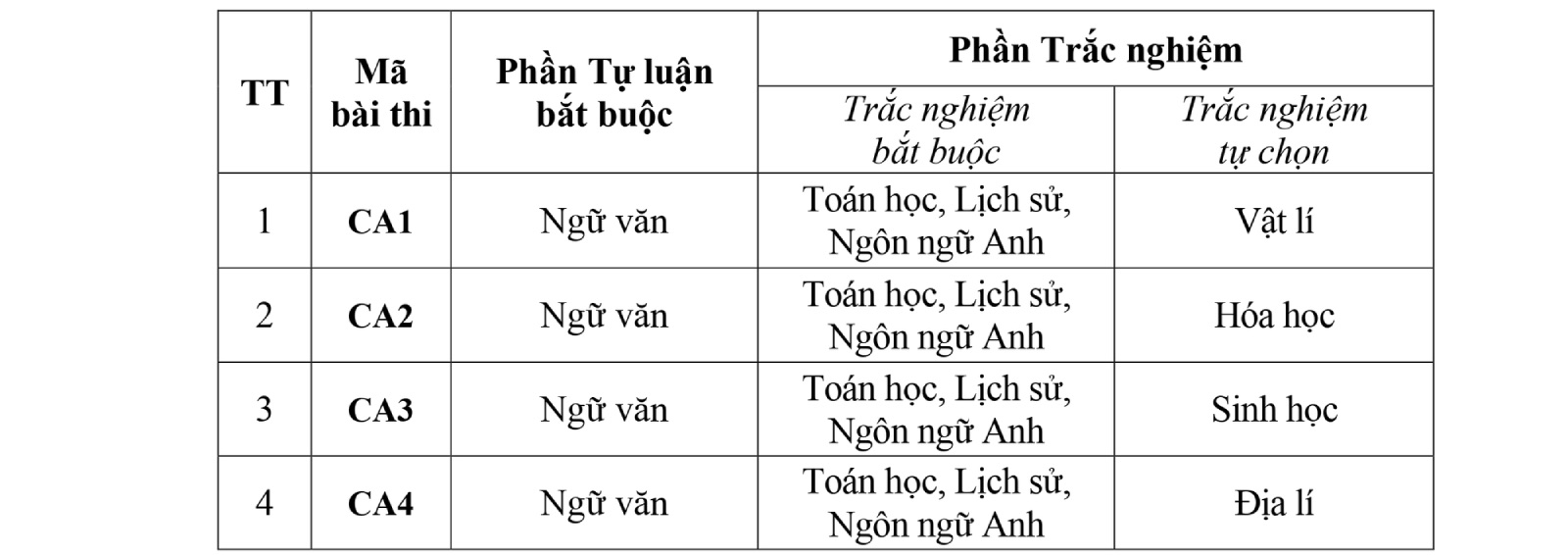 Phần trắc nghiệm tự chọn: 15 câu hỏi, tổng điểm tối đa là 15 điểm. Thí sinh lựa chọn một trong các môn học sau: Vật lí (CA1), Hóa học (CA2), Sinh học (CA3), Địa lí (CA4).