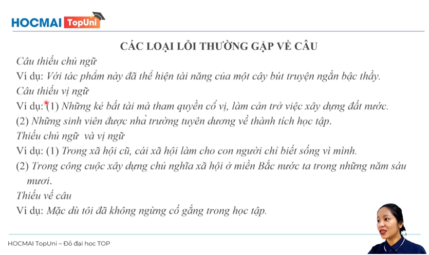 - Cấu trúc câu: thiếu chủ ngữ hoặc vị ngữ do nhầm trạng ngữ là chủ thể.