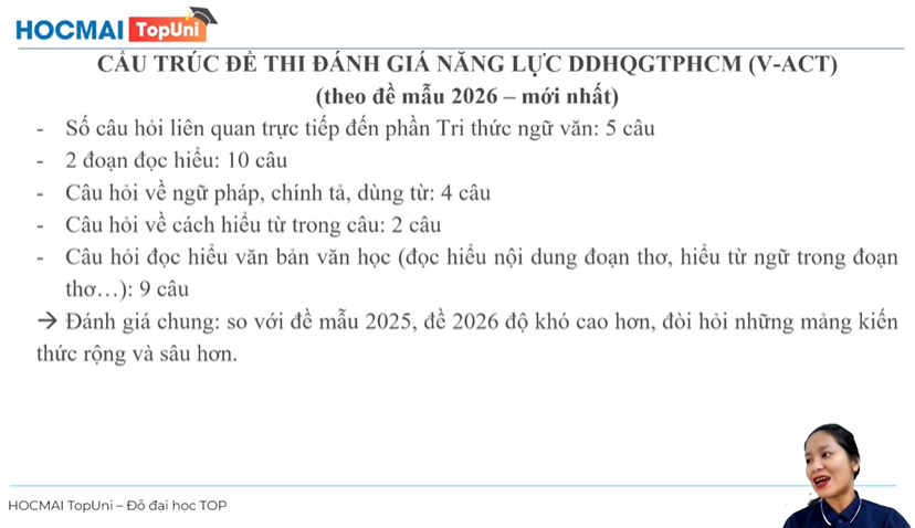 Theo đề mẫu V-ACT năm 2026, cô An cho biết phần Tiếng Việt gồm 30 câu hỏi, chiếm 300/1200 điểm toàn bài. Dù số lượng câu không lớn, nhưng mức độ yêu cầu cao và trải rộng nhiều mảng kiến thức.