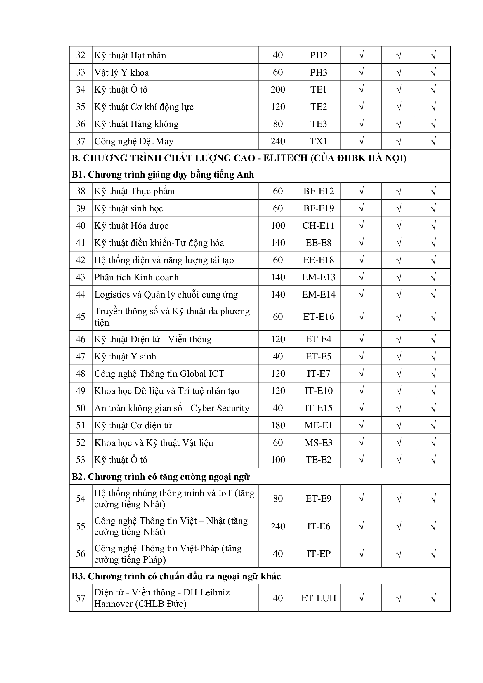 Danh mục chương trình đào tạo, chỉ tiêu, phương thức và mã xét tuyển của Đại học Bách khoa Hà Nội năm 2025 như sau: