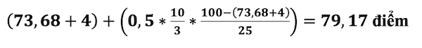 Trường hợp 2: Thí sinh B đạt điểm thi TSA là 73,68, có chứng chỉ ngoại ngữ IELTS 6.5 (được thưởng 4 điểm) và thuộc khu vực 2 nông thôn (+0,5 điểm theo thang 30). Khi đó, điểm xét tuyển được tính như sau: