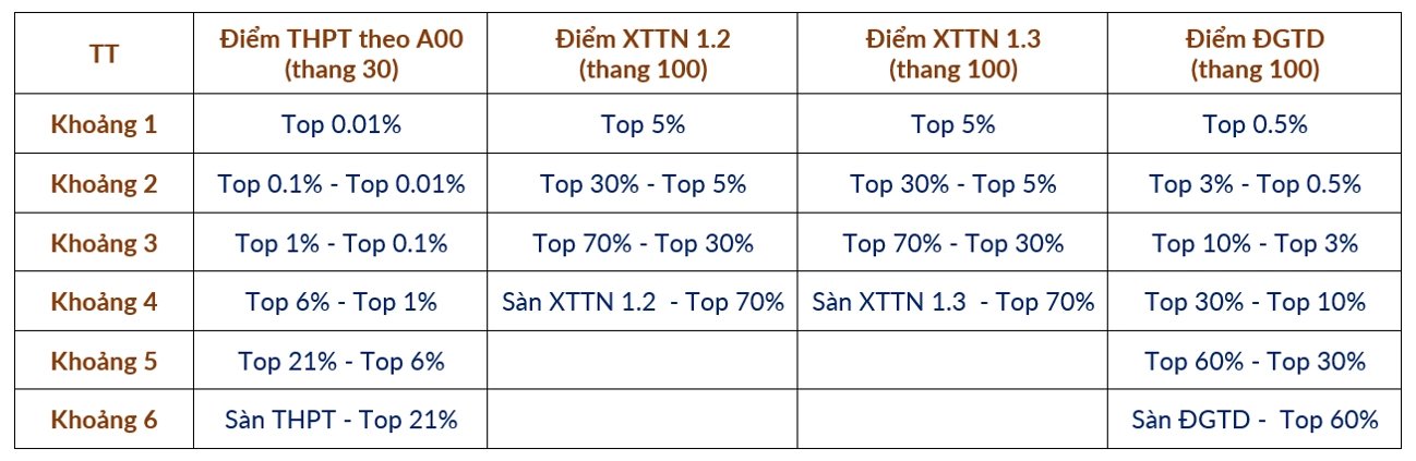 Cụ thể, Top% điểm thi tốt nghiệp THPT được tính trên tổng điểm tổ hợp A00 (từ mức sàn đến 30 điểm), trong khi Top% điểm XTTN diện 1.2 – 1.3 và Top% điểm TSA được quy đổi tương tự.