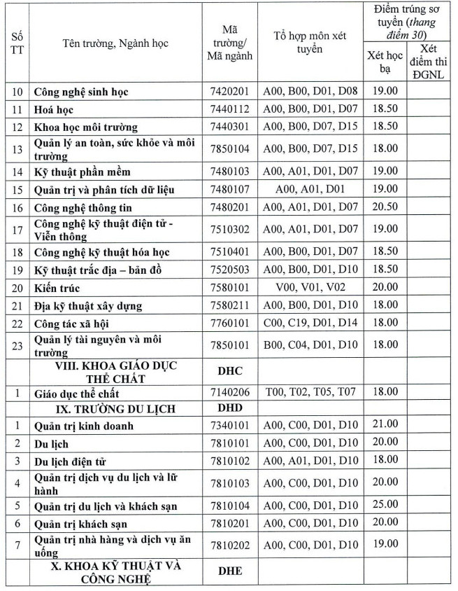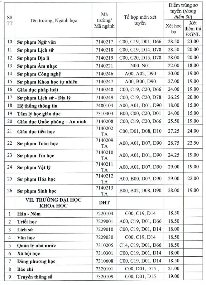 Đại học Huế cũng vừa công bố về điểm chuẩn đánh giá năng lực năm 2023 xét tuyển vào các trường đại học thành viên. Điểm trúng sơ tuyển đợt 1 tuyển sinh năm 2023 theo phương thức xét tuyển sớm: xét điểm thi đánh giá năng lực, xét học bạ của các trường thành viên – Đại học Huế cụ thể như sau: