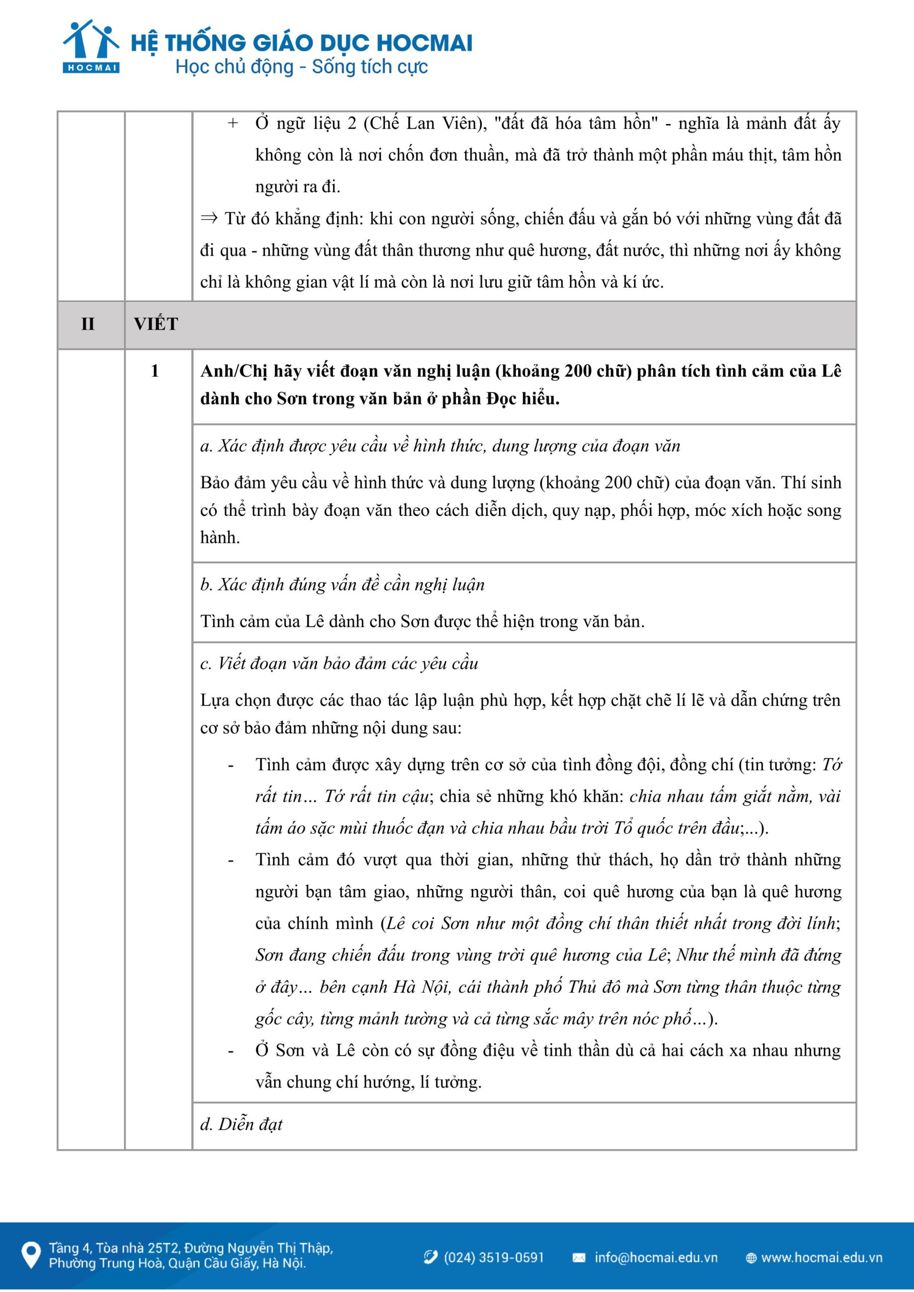 Câu 1 (2,0 điểm): Câu nghị luận văn học đưa ra yêu cầu cụ thể để thí sinh có thể viết một đoạn văn với dung lượng khoảng 200 chữ về một khía cạnh của vấn đề rút ra từ đoạn trích của phần đọc hiểu, đó là yêu cầu “Viết một đoạn văn (khoảng 200 chữ) phân tích tình cảm của Lê dành cho Sơn trong văn bản ở phần Đọc hiểu”. Yêu cầu trong câu viết đoạn cũng là nội dung chính được thể hiện xúc động trong trích đoạn của văn bản; qua việc phân tích tình cảm của Lê dành cho Sơn, thí sinh không chỉ cảm nhận được nội dung của đoạn trích mà còn thực hiện được kỹ năng phân tích một bình diện quan trọng của thể loại truyện kể. Đây cũng là những vấn đề quen thuộc trong yêu cầu cần đạt của chương trình, hy vọng sẽ không làm khó cho thí sinh.