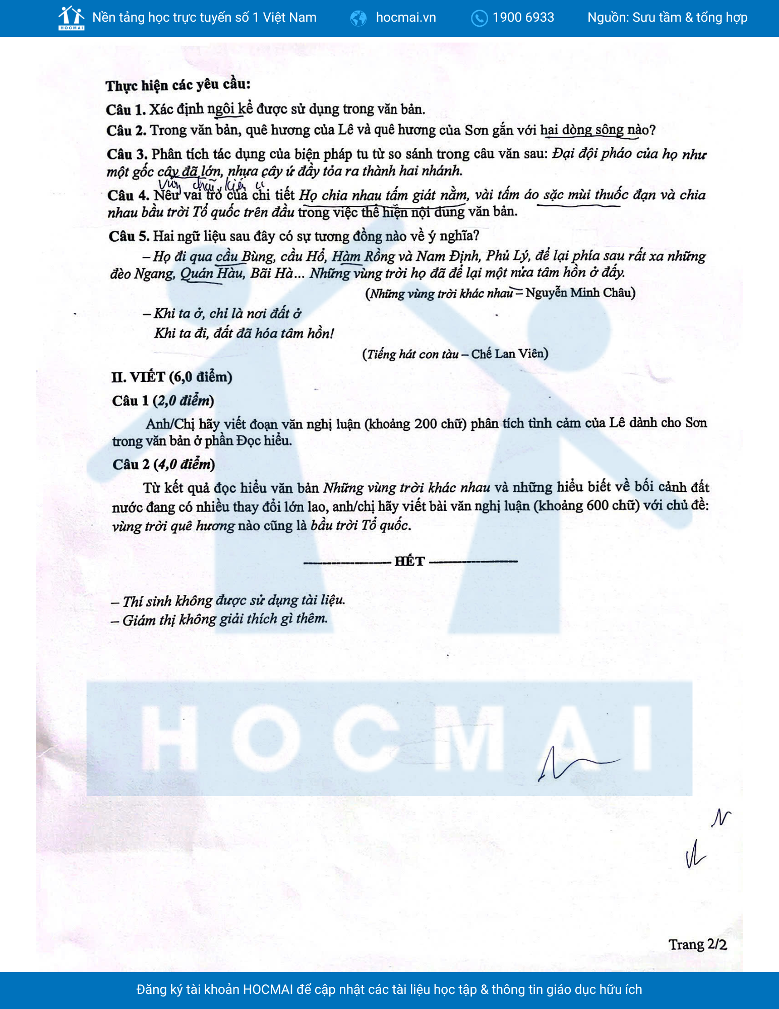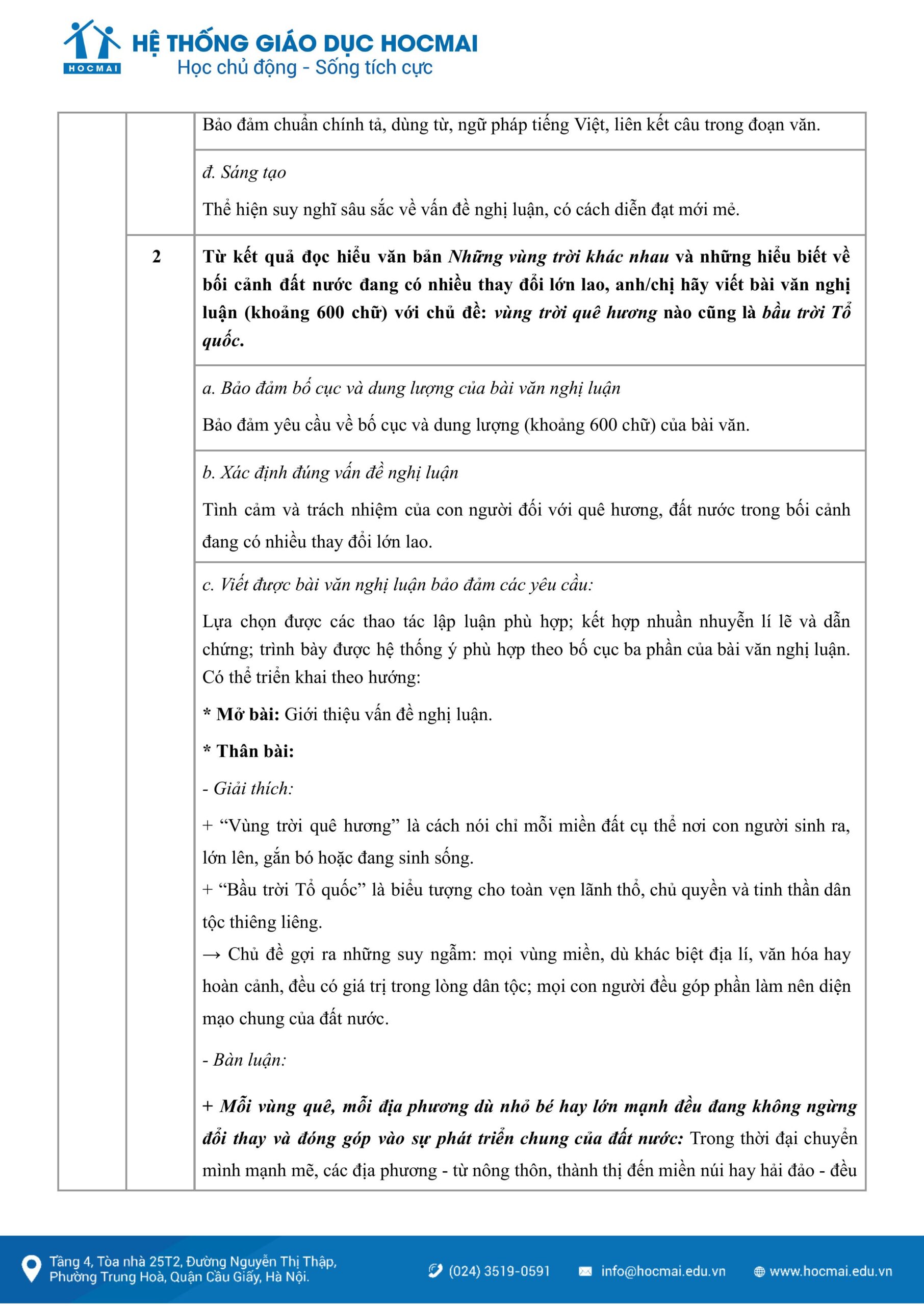 Câu 2 (4,0 điểm): Câu viết bài văn nghị luận xã hội yêu cầu thí sinh vận dụng kết quả đọc hiểu ngữ liệu và những hiểu biết về bối cảnh đất nước, viết bài nghị luận về chủ đề: vùng trời quê hương nào cũng là bầu trời Tổ quốc.