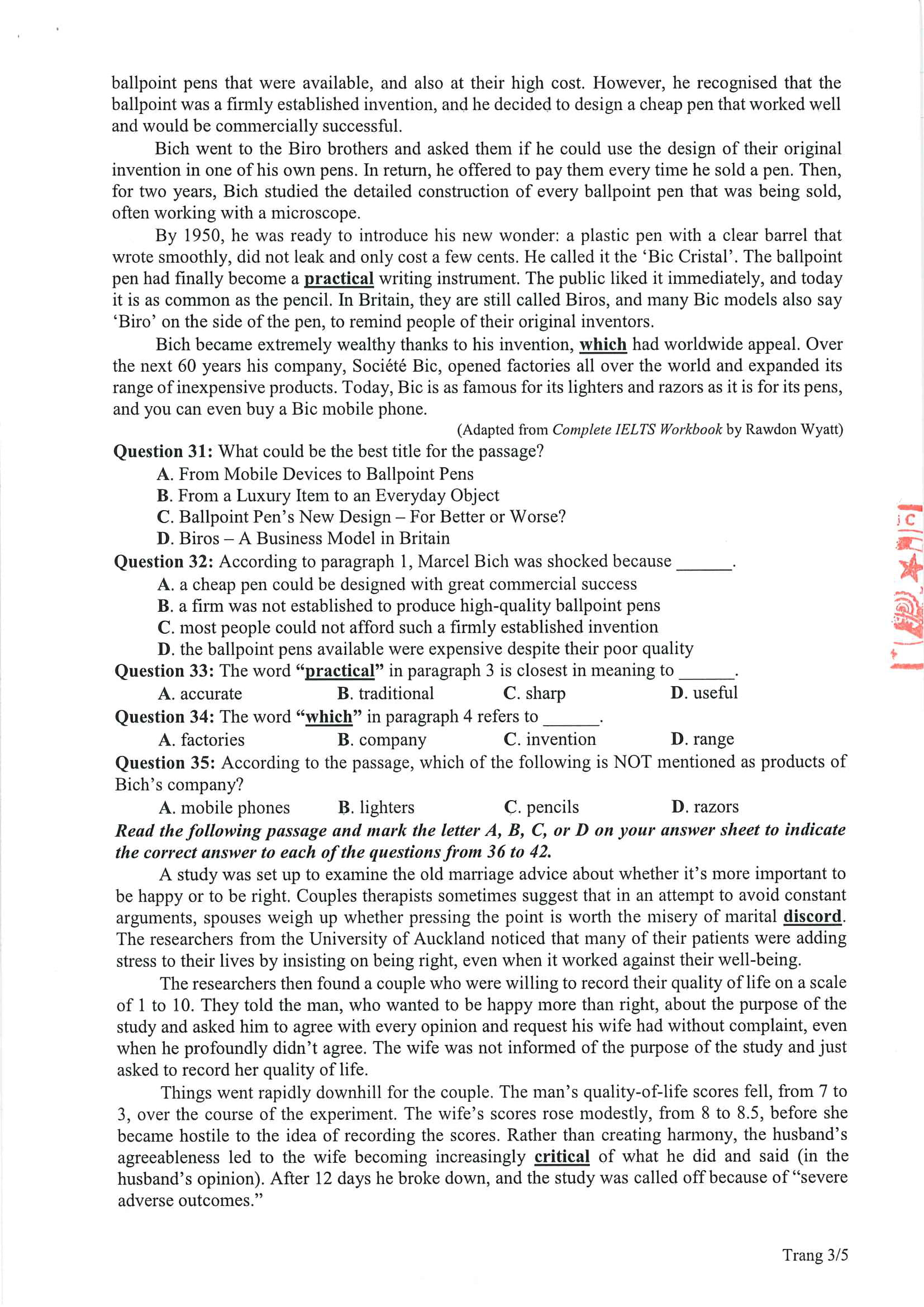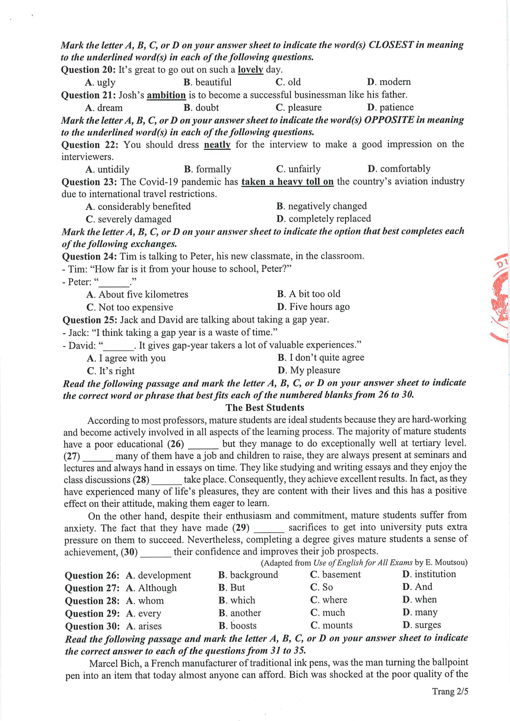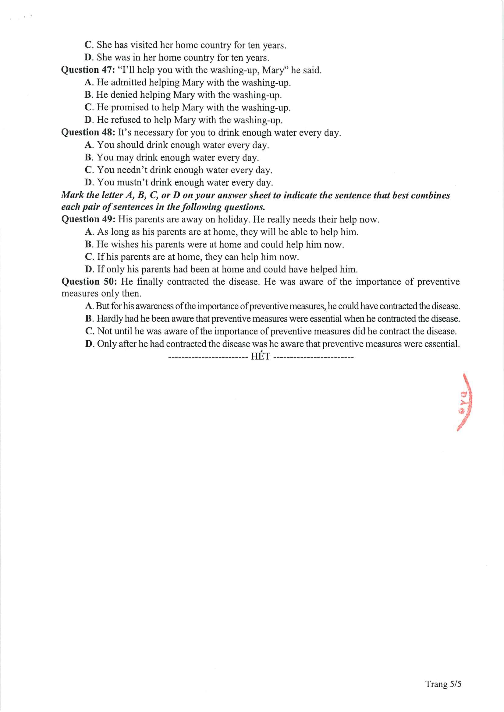 Bộ GD – ĐT đã công bố đề tham khảo thi tốt nghiệp THPT 2021. Dưới đây là đáp án gợi ý đề tham khảo môn Tiếng Anh thí sinh có thể tham khảo:
