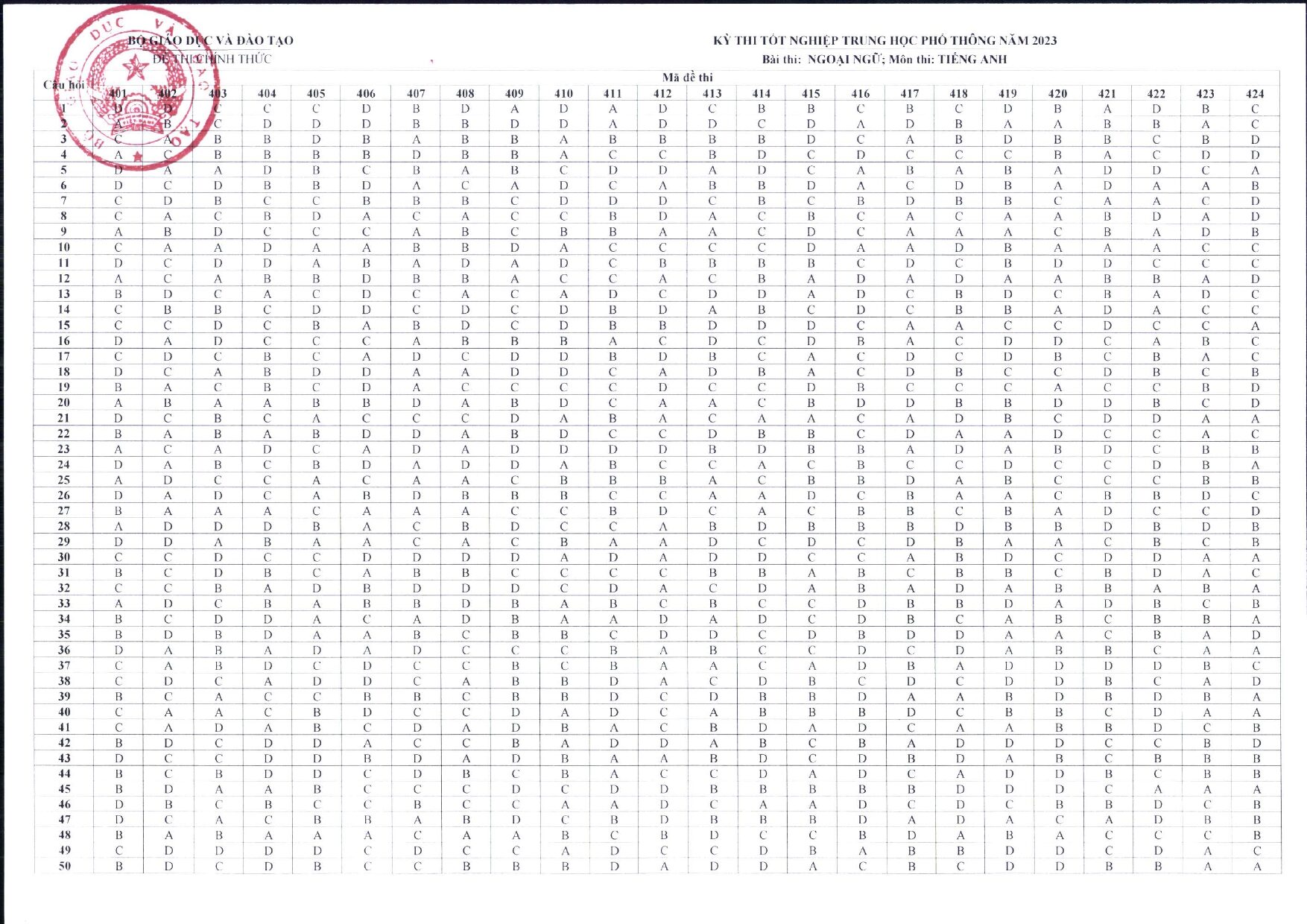 Đáp án chính thức đề thi tốt nghiệp THPT môn Tiếng Anh năm 2023 Full 24 mã đề Bộ DG&ĐT công bố:
