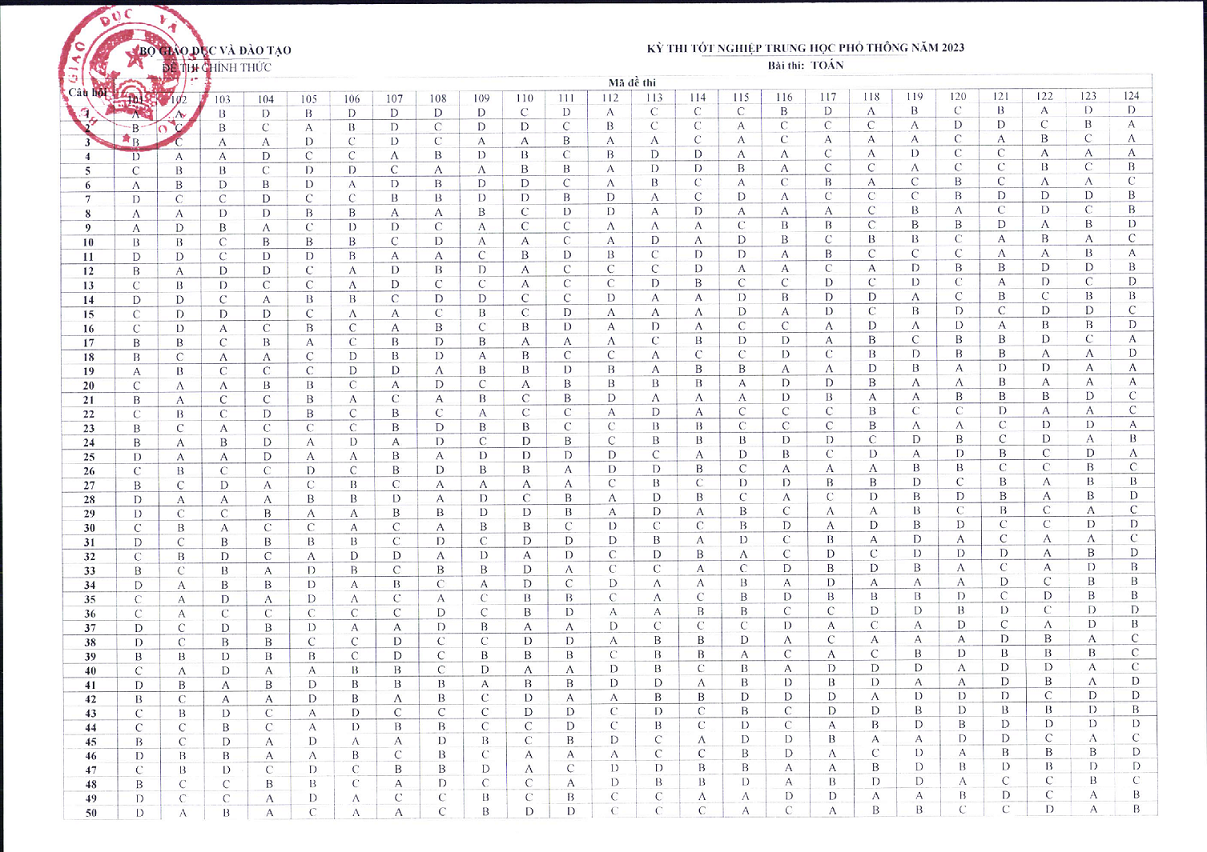 Đáp án chính thức đề thi tốt nghiệp THPT môn Toán năm 2023 Full 24 mã đề: