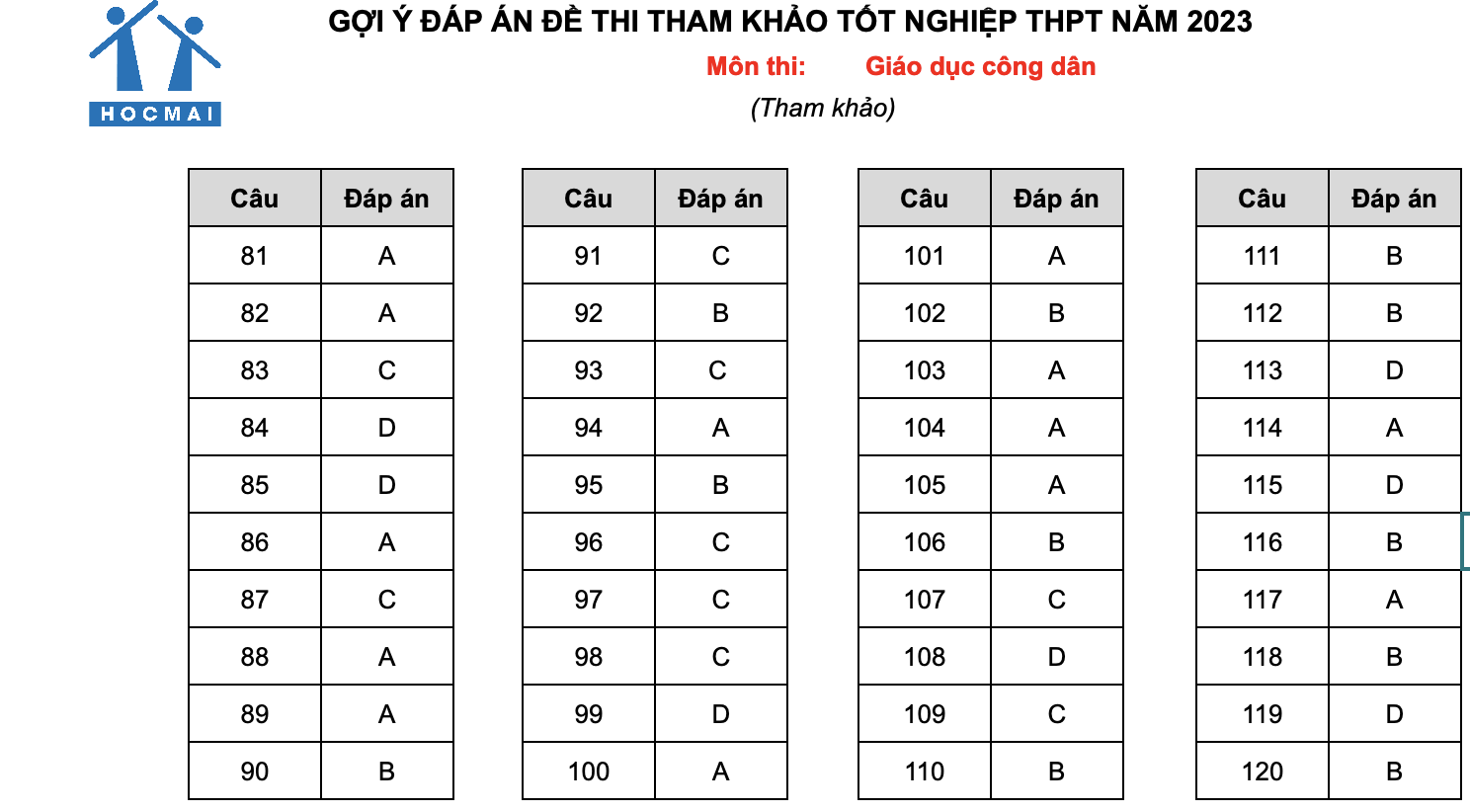 Dưới đây là Đáp án gợi ý đề thi mẫu kỳ thi tốt nghiệp THPT 2023 môn GDCD các em có thể tham khảo: