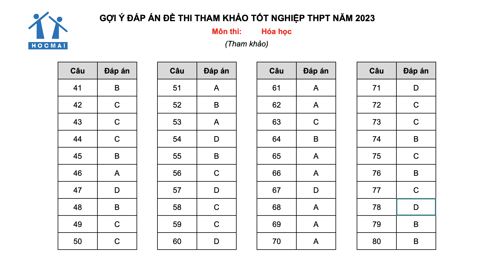 Dưới đây là Đáp án gợi ý đề thi mẫu kỳ thi tốt nghiệp THPT 2023 môn Hóa học các em có thể tham khảo: