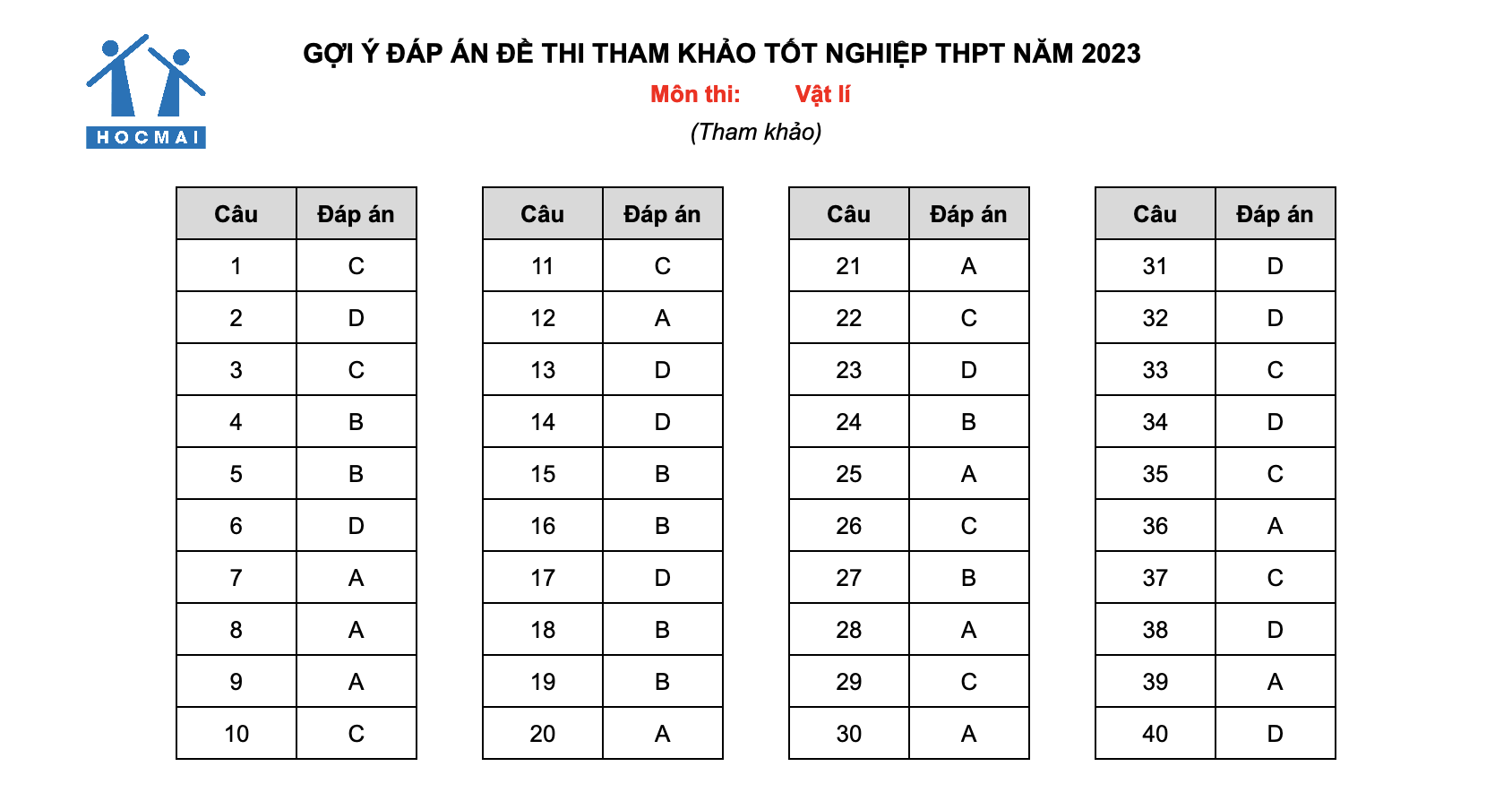 Dưới đây là Đáp án gợi ý đề thi mẫu kỳ thi tốt nghiệp THPT 2023 môn Vật lí các em có thể tham khảo: