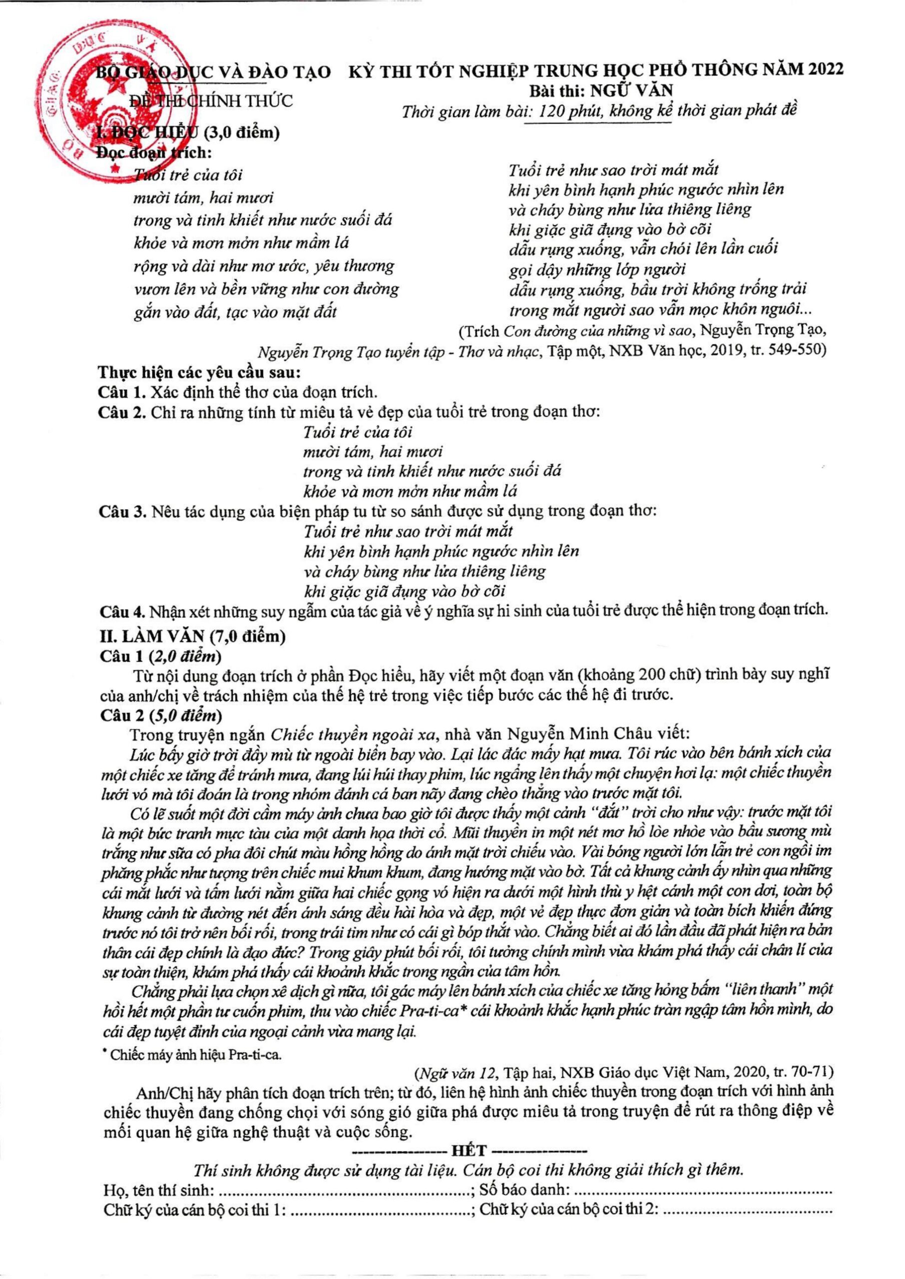 Sáng 07/07/2022 là thời gian diễn ra môn thi đầu tiên của kỳ thi tốt nghiệp THPT 2022 – môn Ngữ văn. Dưới đây là đề và đáp án chính thức môn Ngữ văn do Bộ GD&ĐT công bố: