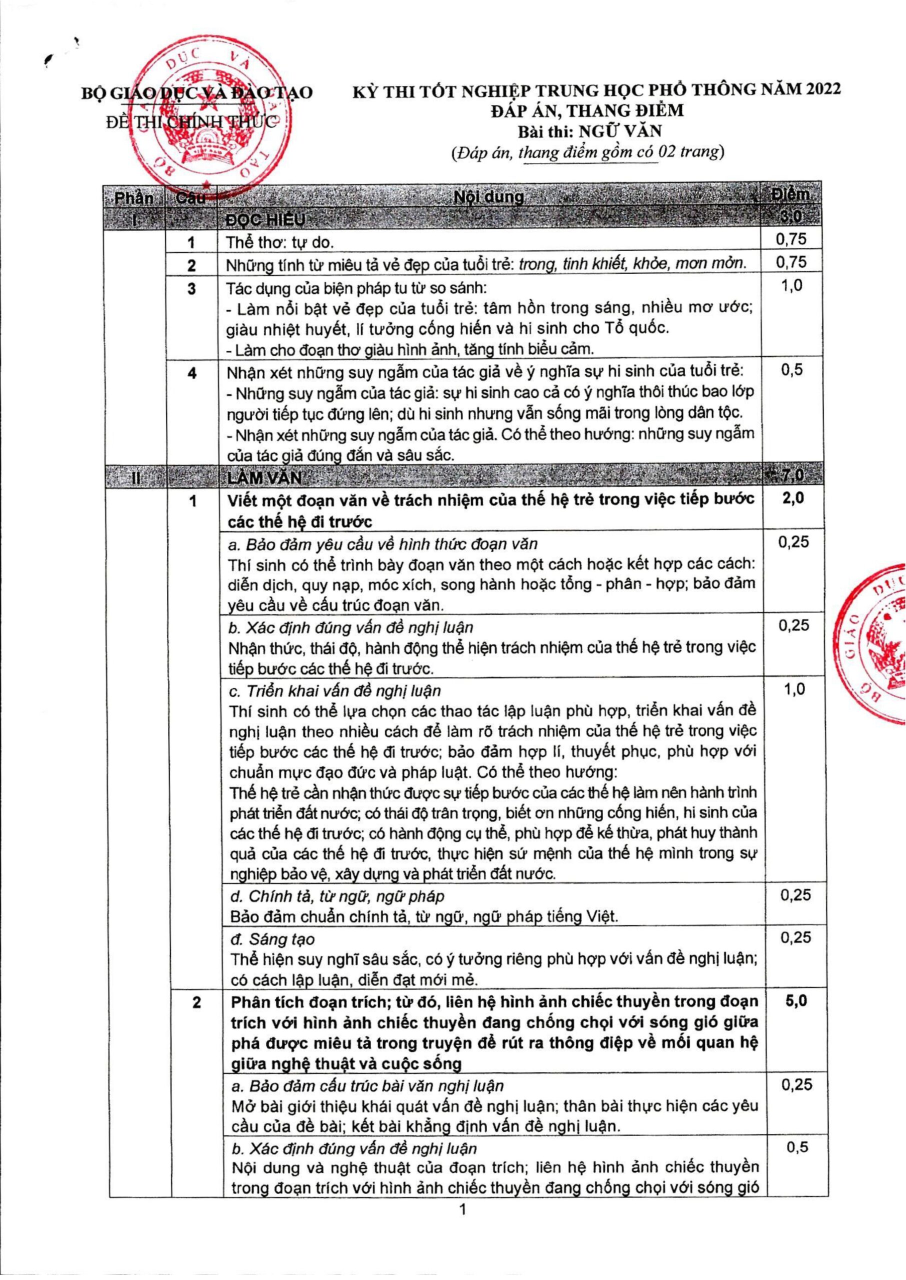 Đáp án môn Văn đề thi tốt nghiệp THPT 2022 (chính thức)