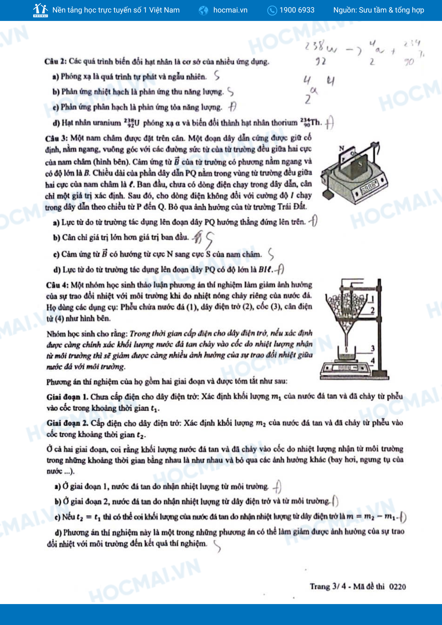 Bối cảnh khoa học – thí nghiệm: Câu 3, 4 phần II (Trắc nghiệm đúng sai) của mã đề 0220 lấy bối cảnh là các mô hình thí nghiệm trong chủ đề Từ trường và Vật lí nhiệt. Để nắm rõ các thiết bị đo, mô hình hiện tượng, đòi hỏi học sinh đọc hiểu và xử lí dữ liệu khoa học như một người làm thí nghiệm.