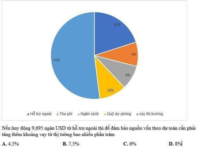 Theo nhận định của một số giáo viên môn Toán, câu hỏi này gần như đang “đánh đố” thí sinh khi đề bài không cho biết dữ kiện về tổng nguồn vốn ban đầu. Phần này chiến tới 30 điểm trong đề thi, gây bất lợi cho các em học sinh. “Đề phải cho nguồn vốn theo dự toán là bao nhiêu, để mình biết 9,695 nghìn đô từ hỗ trợ ngoài chiếm bao nhiêu % nguồn vốn và thiếu bao nhiêu so với dự toán là 20% thì mới biết cần phải tăng thêm khoảng vay từ thị trường bao nhiêu %”, giáo viên Toán này chia sẻ thêm.