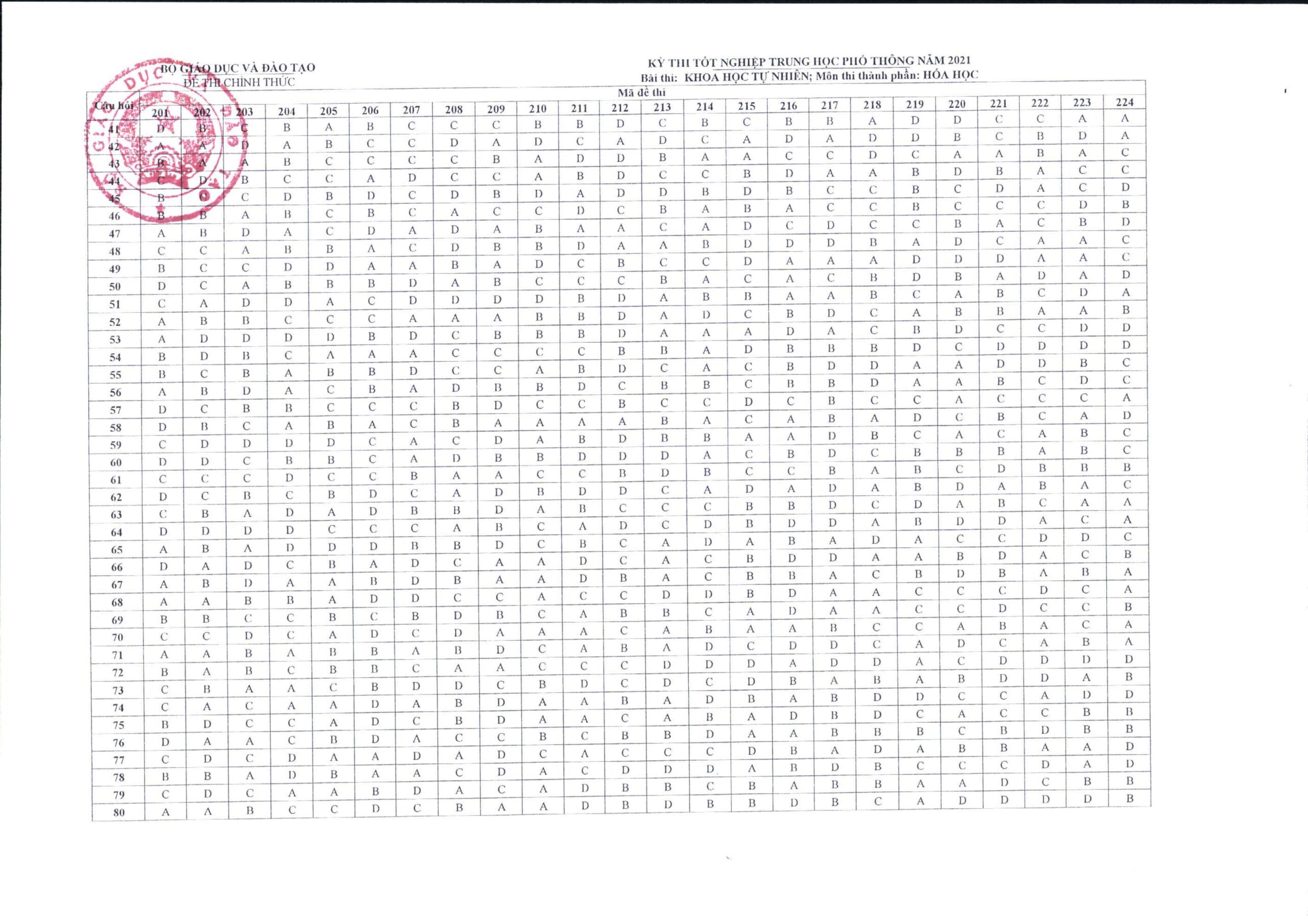 Đáp án môn Hóa học thi tốt nghiệp THPT 2021 đã được Bộ Giáo dục và Đào tạo công bố, dưới đây là chi tiết đáp án: