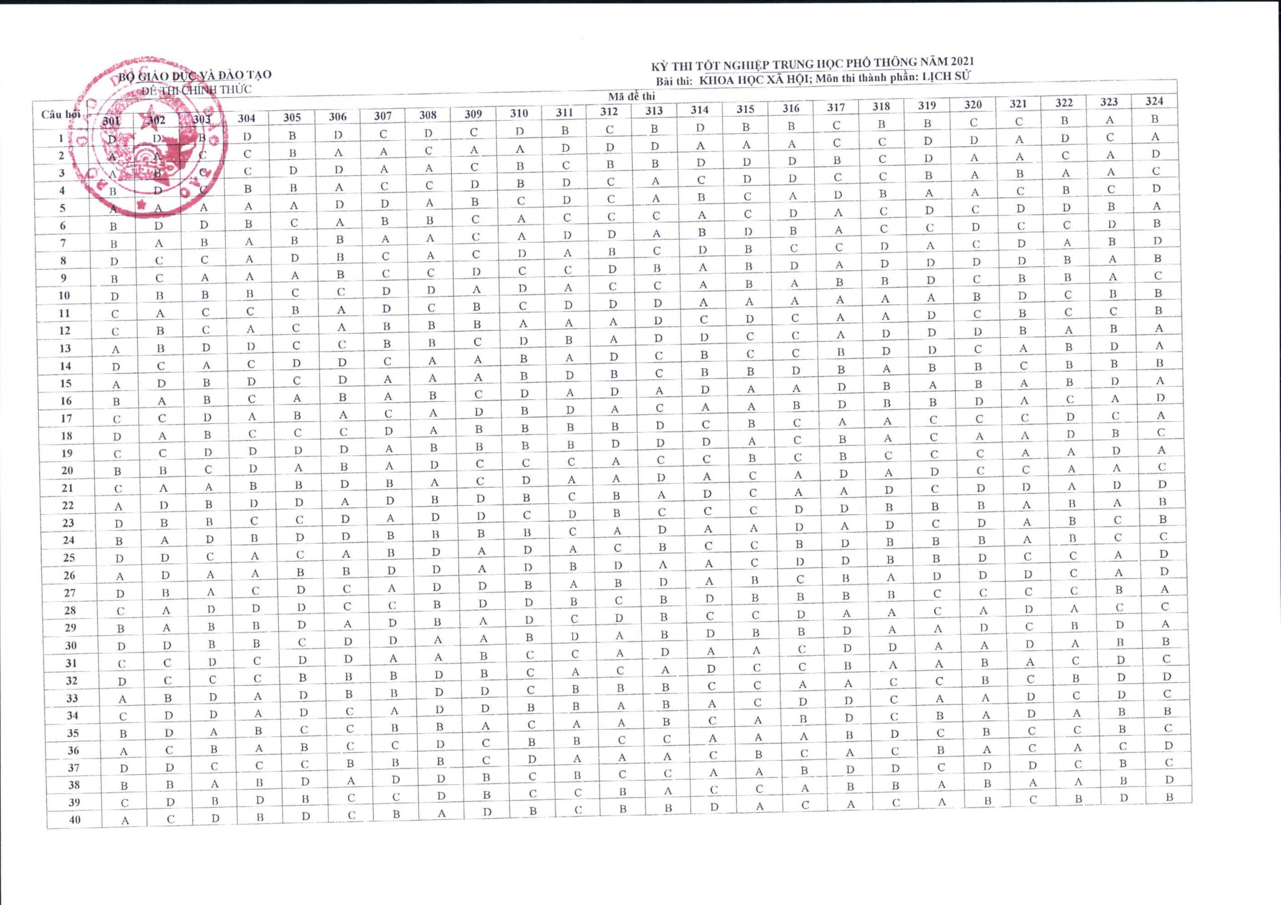 Đáp án môn Lịch sử thi tốt nghiệp THPT 2021 đã được Bộ Giáo dục và Đào tạo công bố vào ngày 15/7/2021. Dưới đây là chi tiết đáp án 24 mã đề: