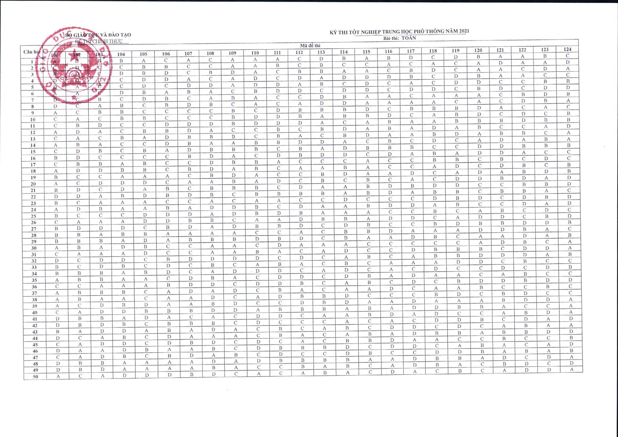 Đáp án chính thức bài thi môn Toán của kỳ thi Tốt nghiệp THPT năm 2021 được Bộ Giáo dục và Đào tạo công bố vào sáng ngày 15/7/2021. Dưới đây là đáp án chi tiết: