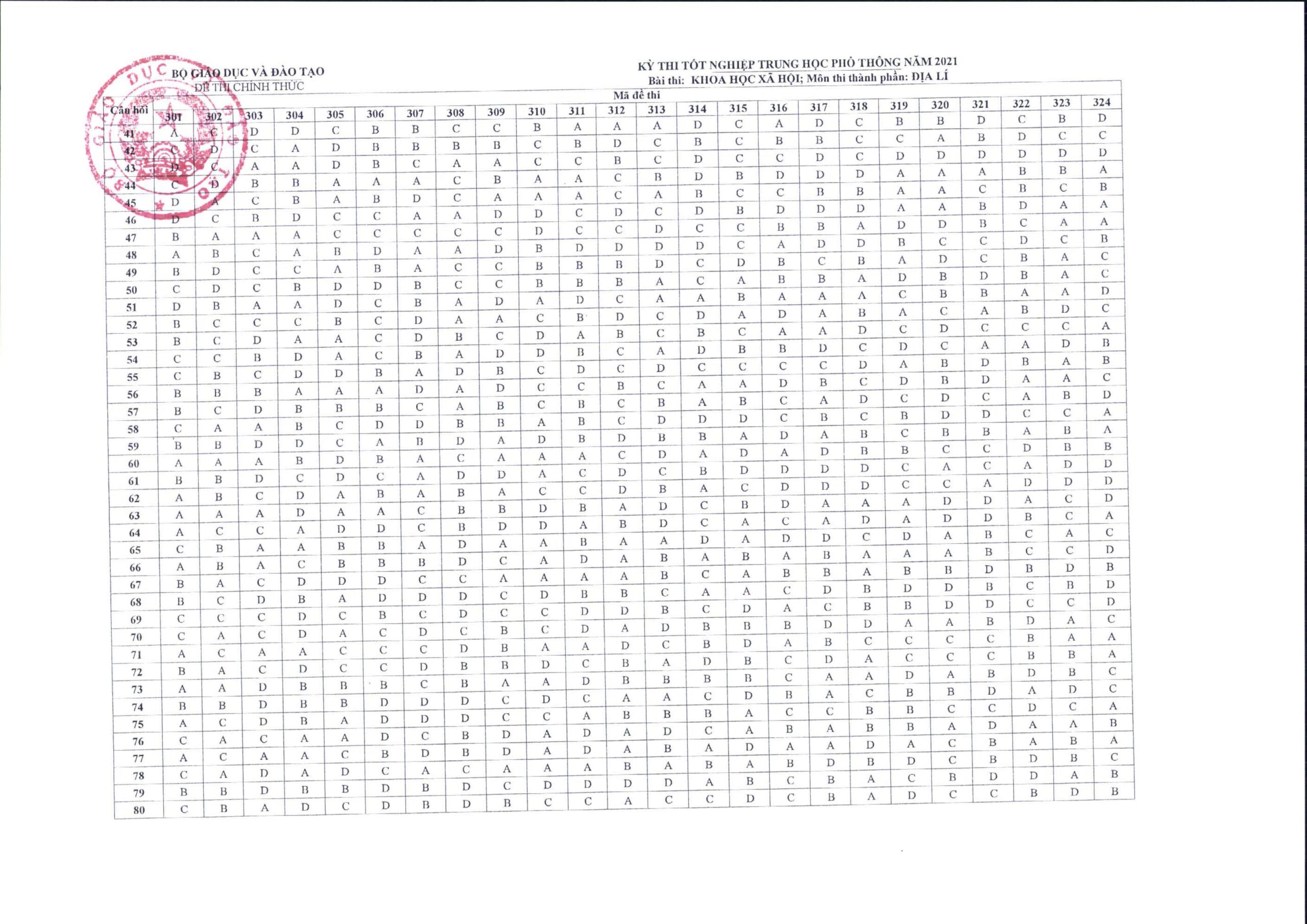 Bộ Giáo dục và Đào tạo đã công bố full đáp án 24 mã đề môn Địa lí thi tốt nghiệp THPT năm 2021. Dưới đây là chi tiết đáp án:
