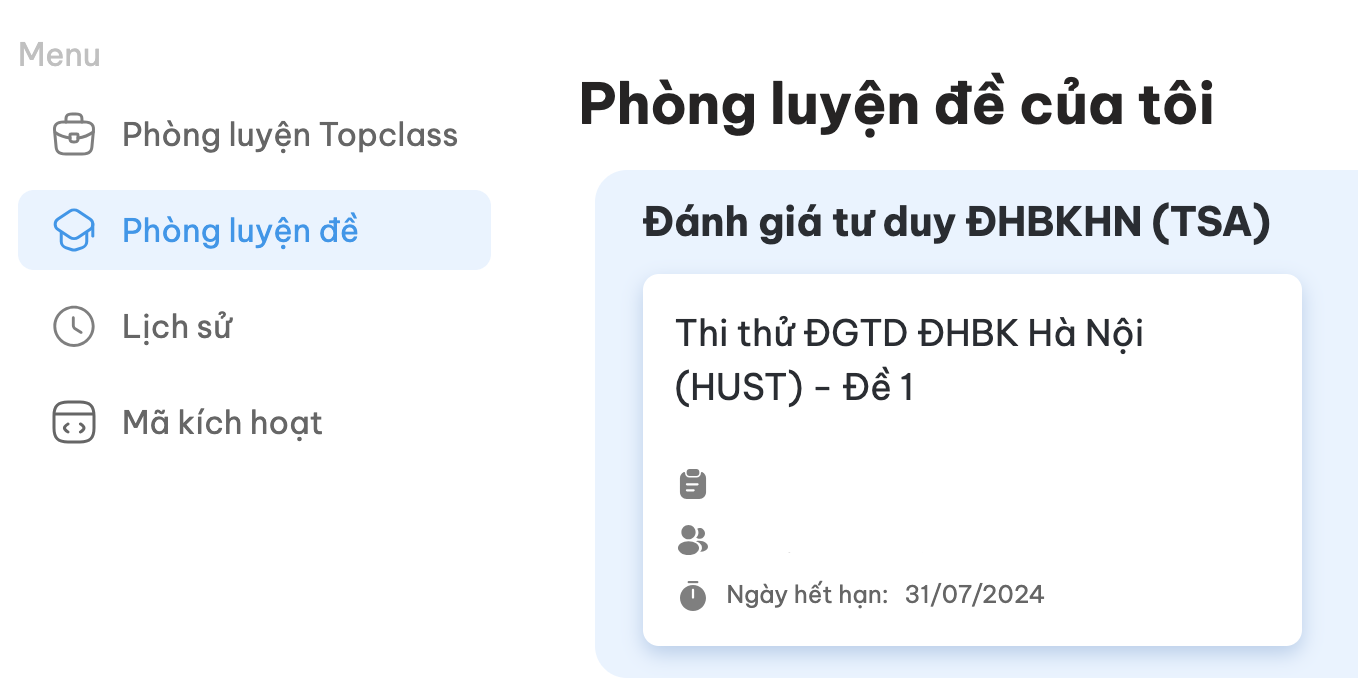 Lưu ý: HS bắt buộc phải kích hoạt mã gói thi thử ở trang “Khóa học của tôi” trước, sau đó mới có thể tham gia làm bài ở phòng thi thử