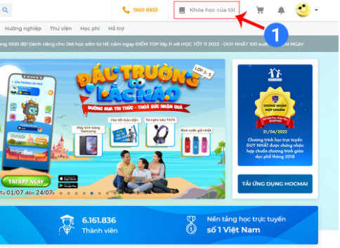 Truy cập “Khoá học của tôi” ở góc trên bên phải màn hình tại trang chủ hocmai.vn