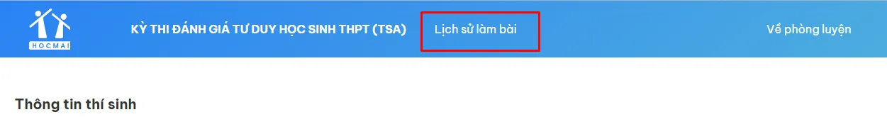 Ngoài ra, thí sinh có thể xem lại kết quả bài thi của mình bằng cách đăng nhập vào tài khoản làm bài >>> Chọn “Lịch sử làm bài”.
