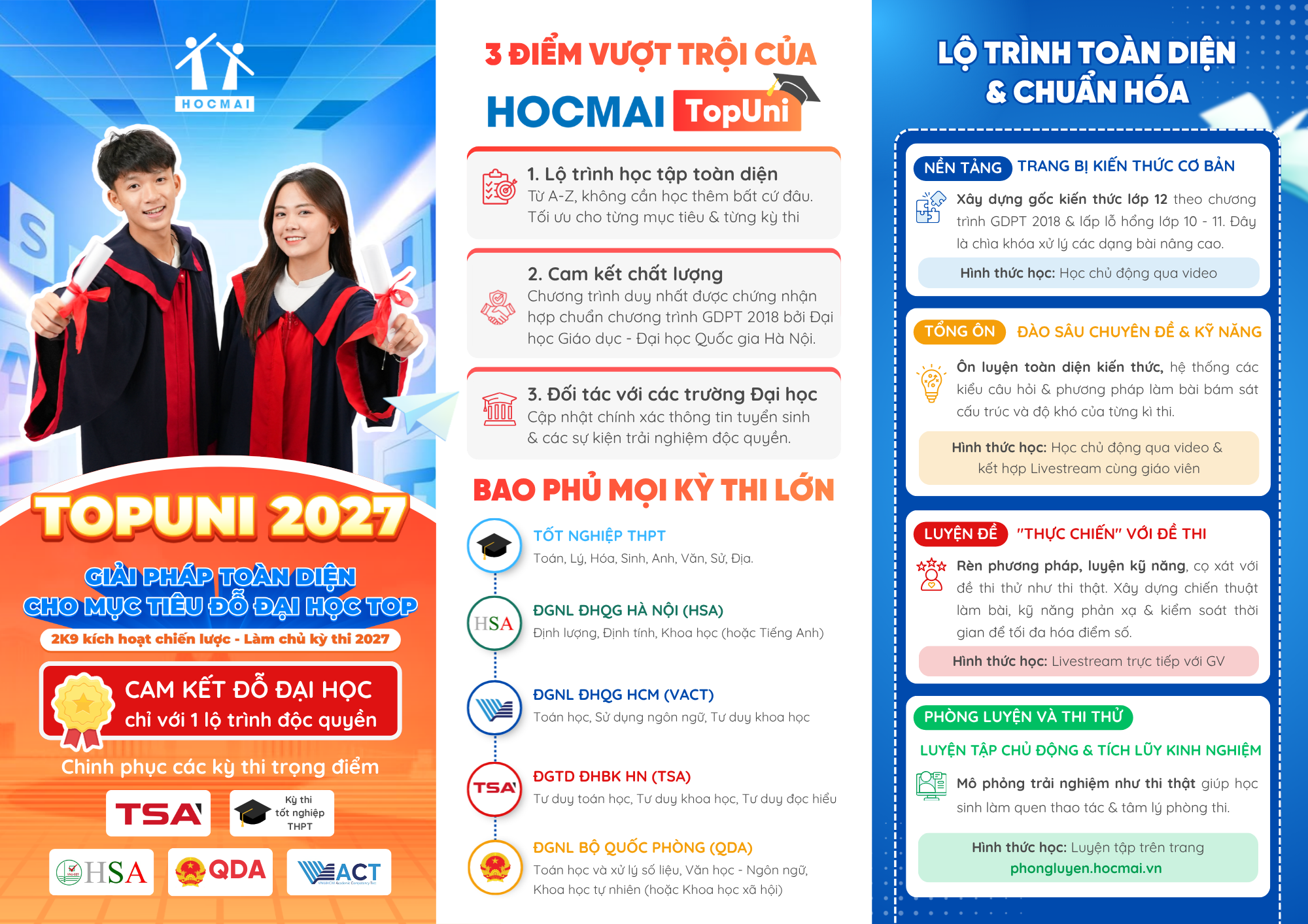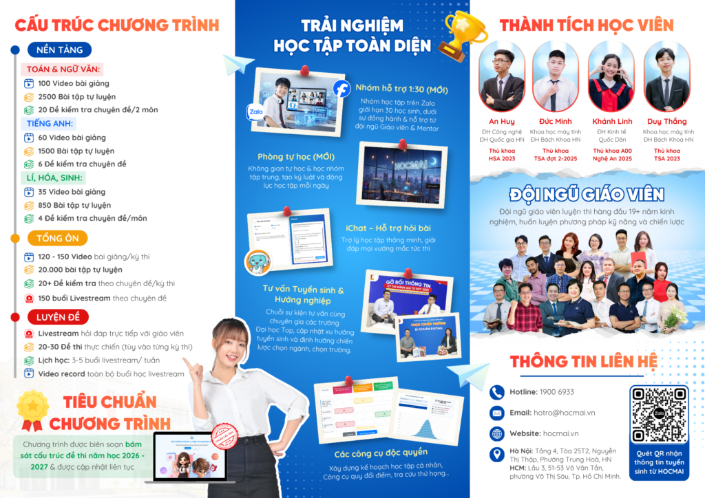 Thứ nhất, chương trình được thiết kế cho nhiều kỳ thi lớn như tốt nghiệp THPT, HSA, TSA, VACT, QDA, giúp học sinh linh hoạt trước các phương thức xét tuyển.