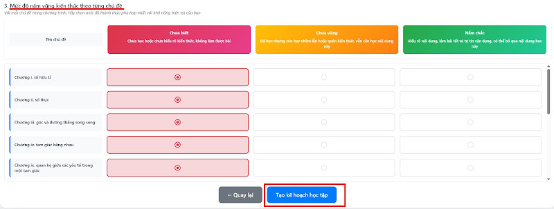 - Nhập thông tin năng lực hiện tại: mức độ tiếp thu, mục tiêu điểm số, mức độ nắm vững theo chủ đề.