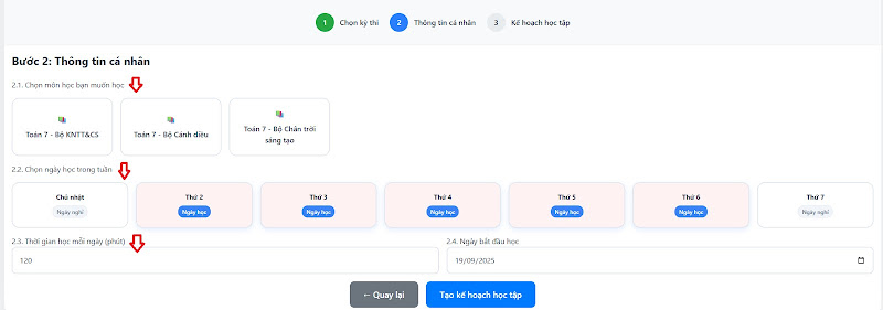 - Nhập thông tin cá nhân (bộ SGK, lịch học trong tuần, thời gian học/ngày, ngày bắt đầu).