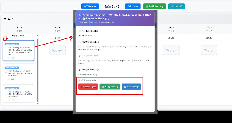 Ấn nút “Tạo kế hoạch học tập” và Bạn đã có ngay kế hoạch học tập cả năm học và được phân chia rõ ràng nội dung học từng tuần.