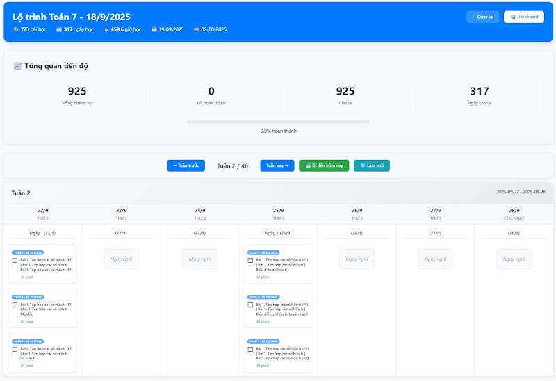 - Hệ thống tự động tạo kế hoạch học tập cả năm, phân chia chi tiết theo từng tuần.