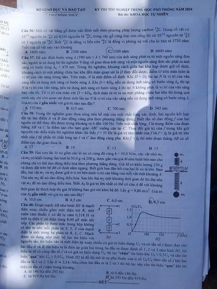 Đề thi chính thức môn Vật lí tốt nghiệp THPT 2024