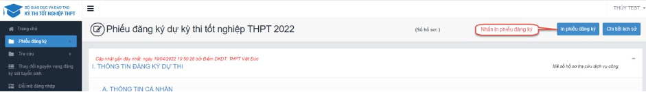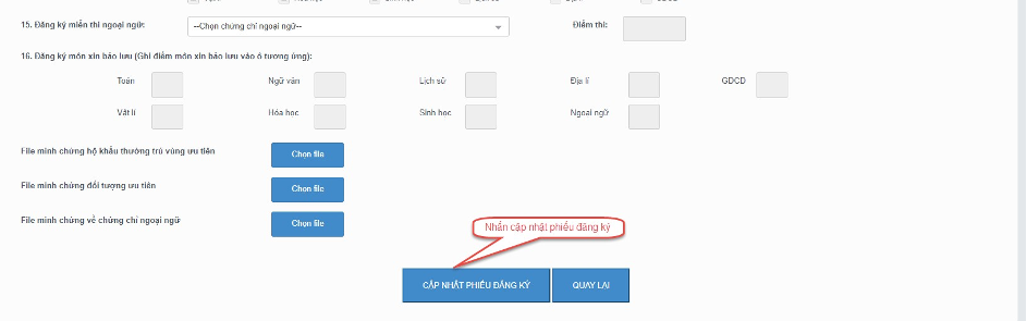 Bước 2: Sau khi sửa thông tin, thí sinh bấm Cập nhật phiếu đăng ký