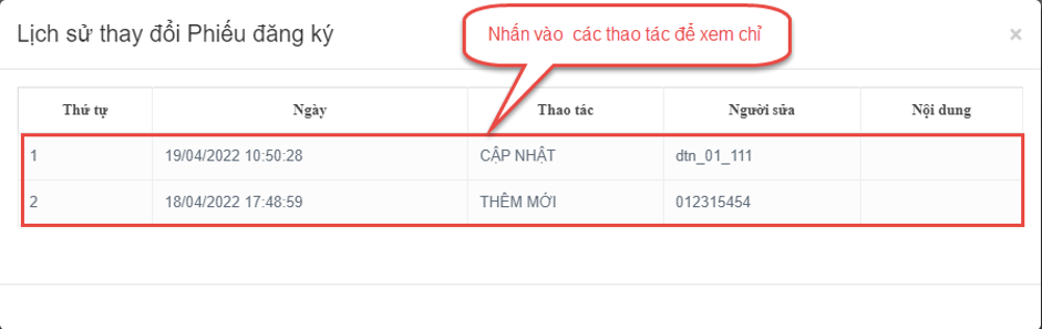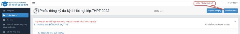 Bước 2: Thí sinh có thể nhấp vào các mục tại cột Thao tác để xem chi tiết lịch sử phiếu như hình sau: