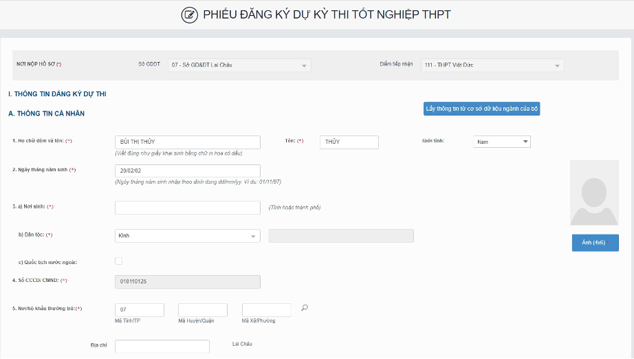 – Mục ảnh: Ảnh chỉ nhận các định dạng ‘jpg’, ‘jpeg’. Ảnh tải lên tại mục này là ảnh thẻ.