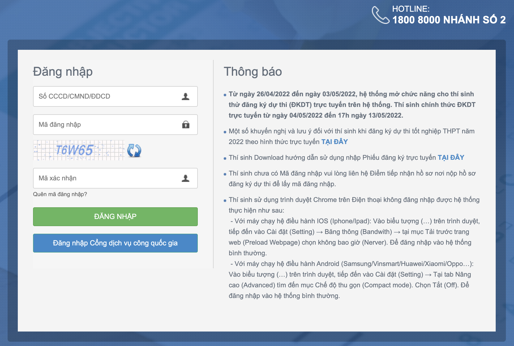 Lưu ý: Nếu thí sinh sử dụng trình duyệt Chrome trên Điện thoại không đăng nhập được hệ thống thực hiện như sau: