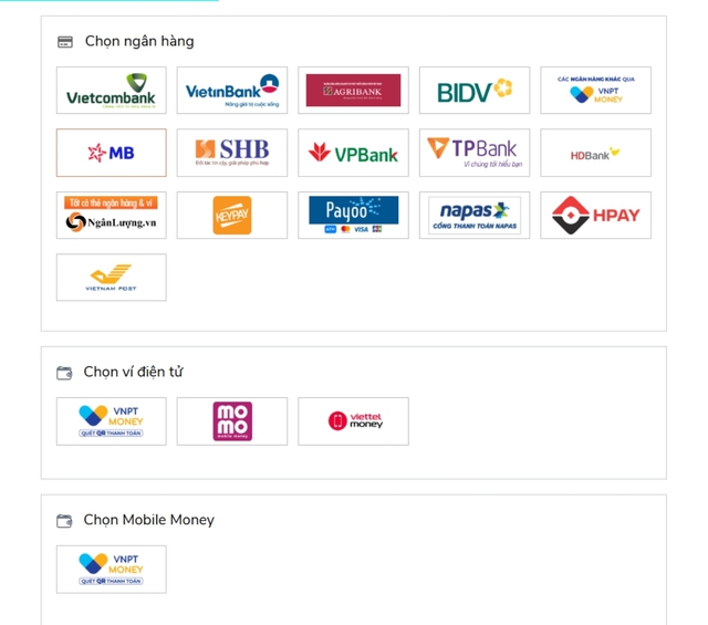 4. Bước 4: Chọn kênh thanh toán: Hệ thống sẽ chuyển hướng sang cổng thanh toán quốc gia. Tại đây, bạn chọn 1 trong 15 kênh thanh toán phù hợp.
