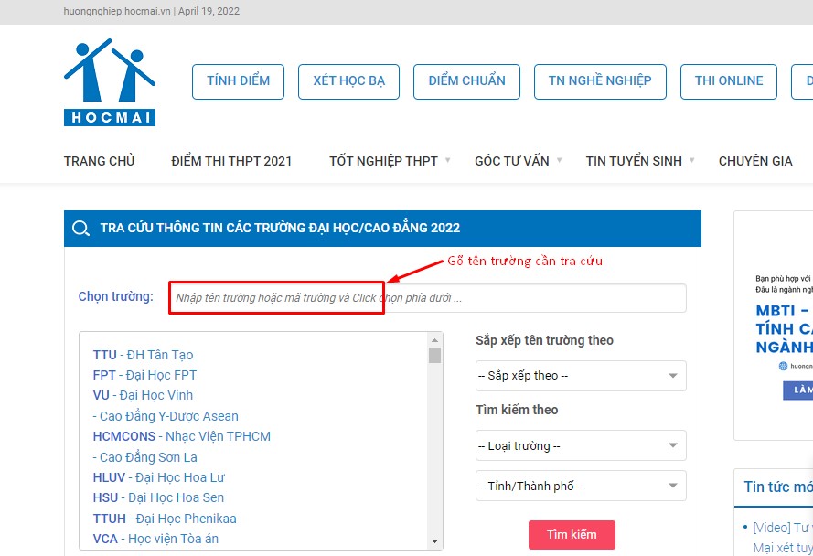 Lúc này, giao diện sẽ hiển thị vùng để thí sinh gõ tên trường đại học cần tra cứu (Ảnh 2).