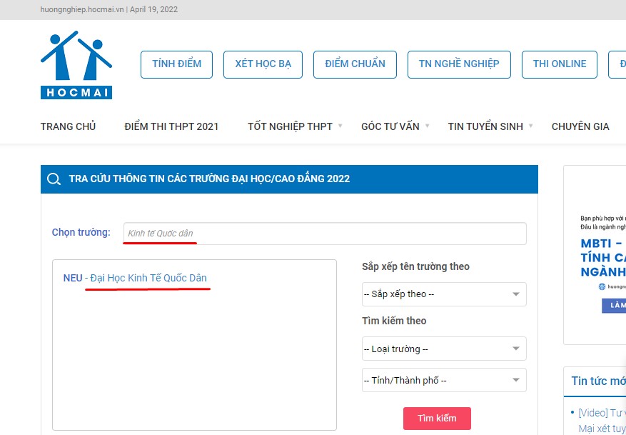 Bước 3. Tra cứu: Thí sinh gõ tên trường cần tra cứu, VD: “Kinh tế Quốc dân” và click vào kết quả đã được hệ thống lọc (Ảnh 3).