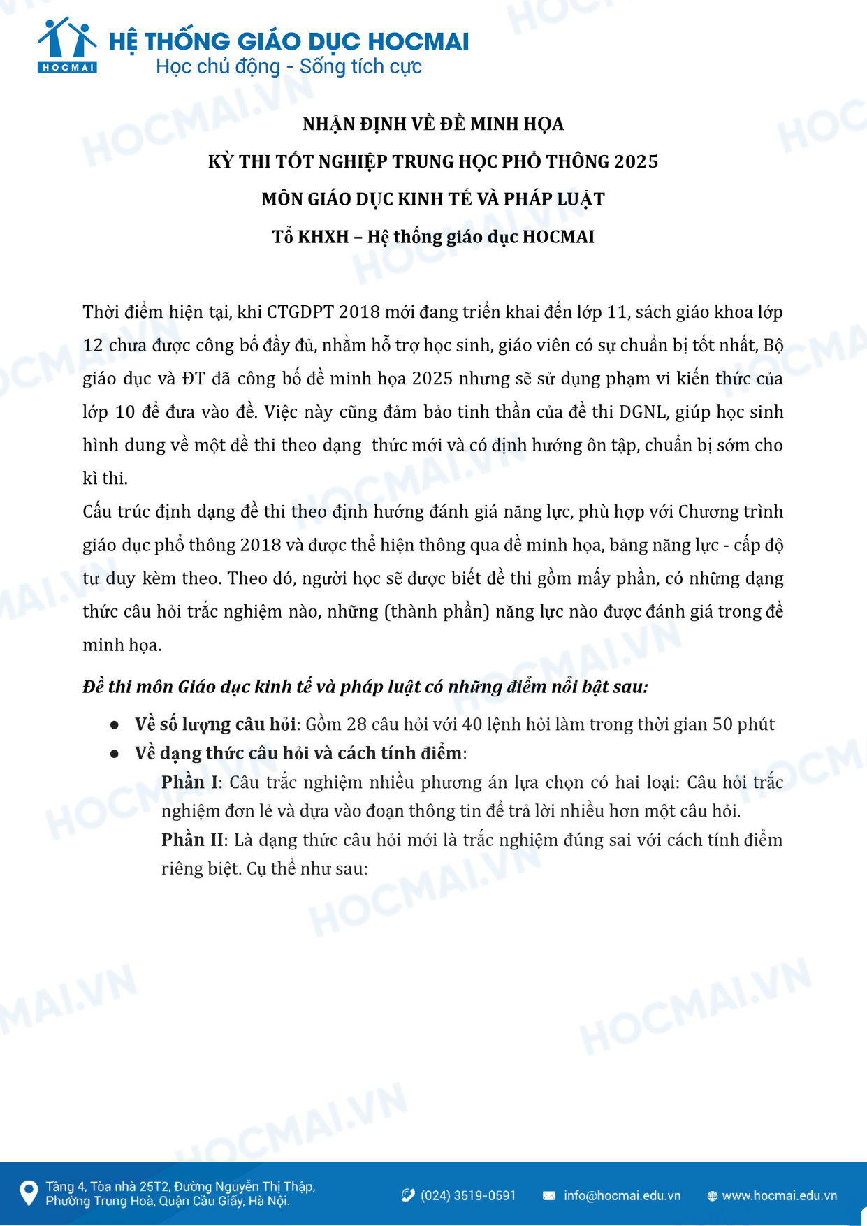Bộ GD&ĐT vừa công bố định dạng đề minh hoạ kỳ thi Tốt nghiệp THPT 2025. Cùng theo dõi nhận định và phân tích đề thi mẫu môn Giáo dục kinh tế & Pháp luật do Hệ thống giáo dục HOCMAI thực hiện nhé!