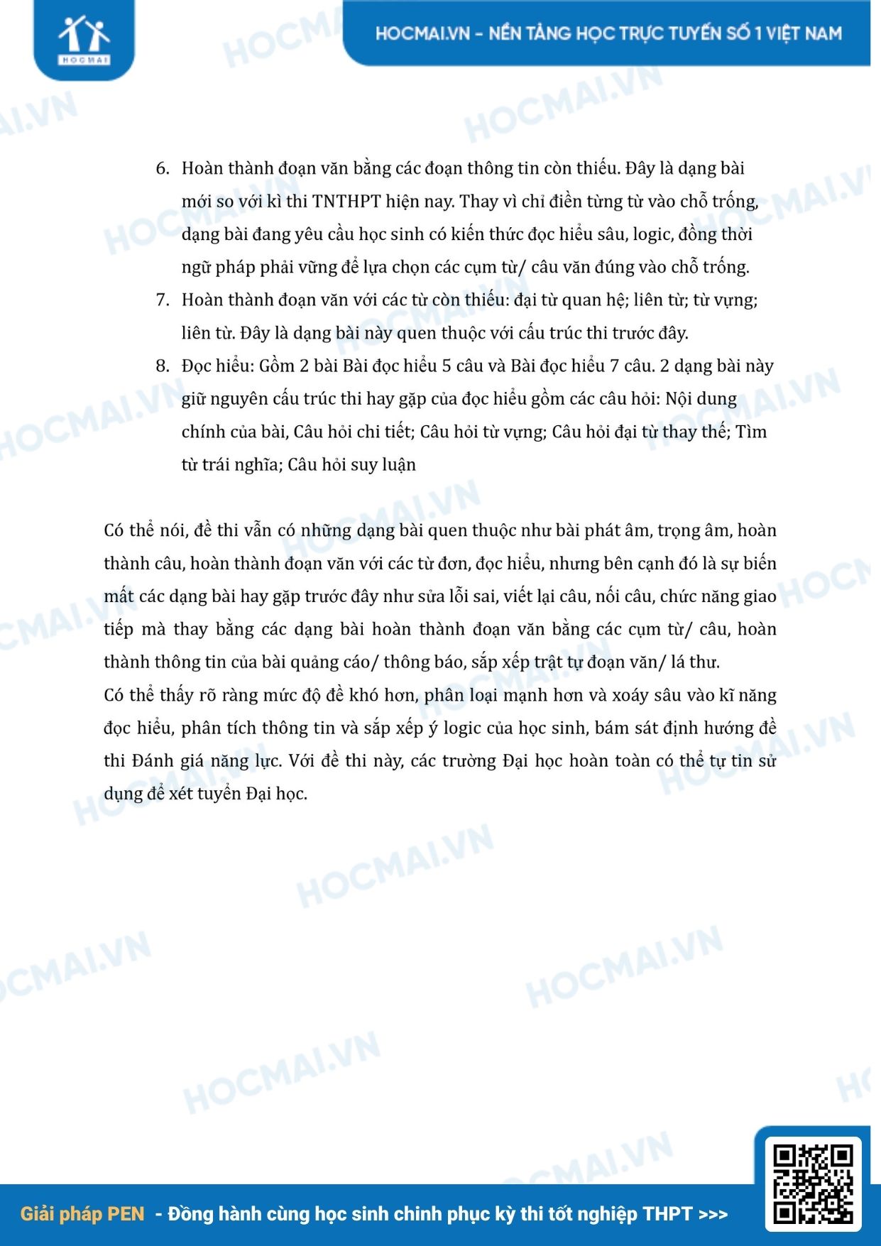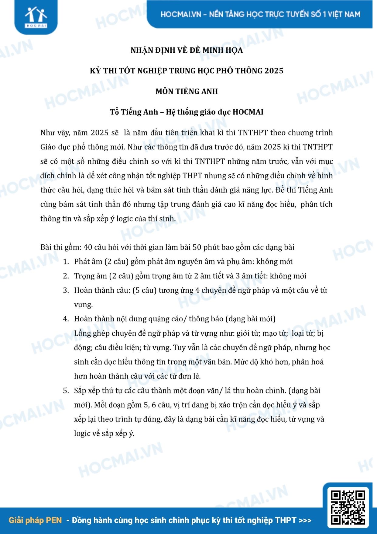 Bộ GD&ĐT vừa công bố định dạng đề minh hoạ kỳ thi Tốt nghiệp THPT 2025. Cùng theo dõi nhận định và phân tích đề thi mẫu môn Tiếng Anh do Hệ thống giáo dục HOCMAI thực hiện nhé!