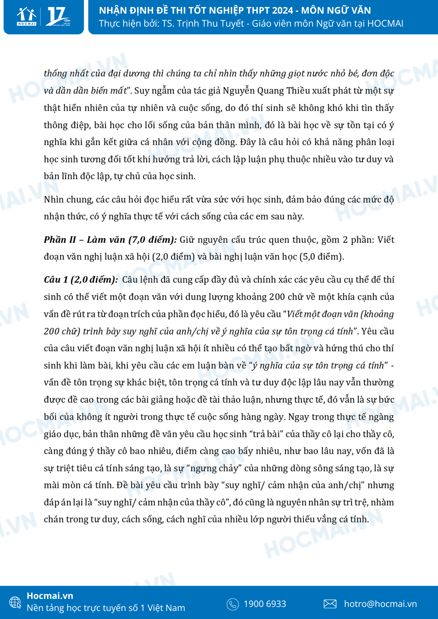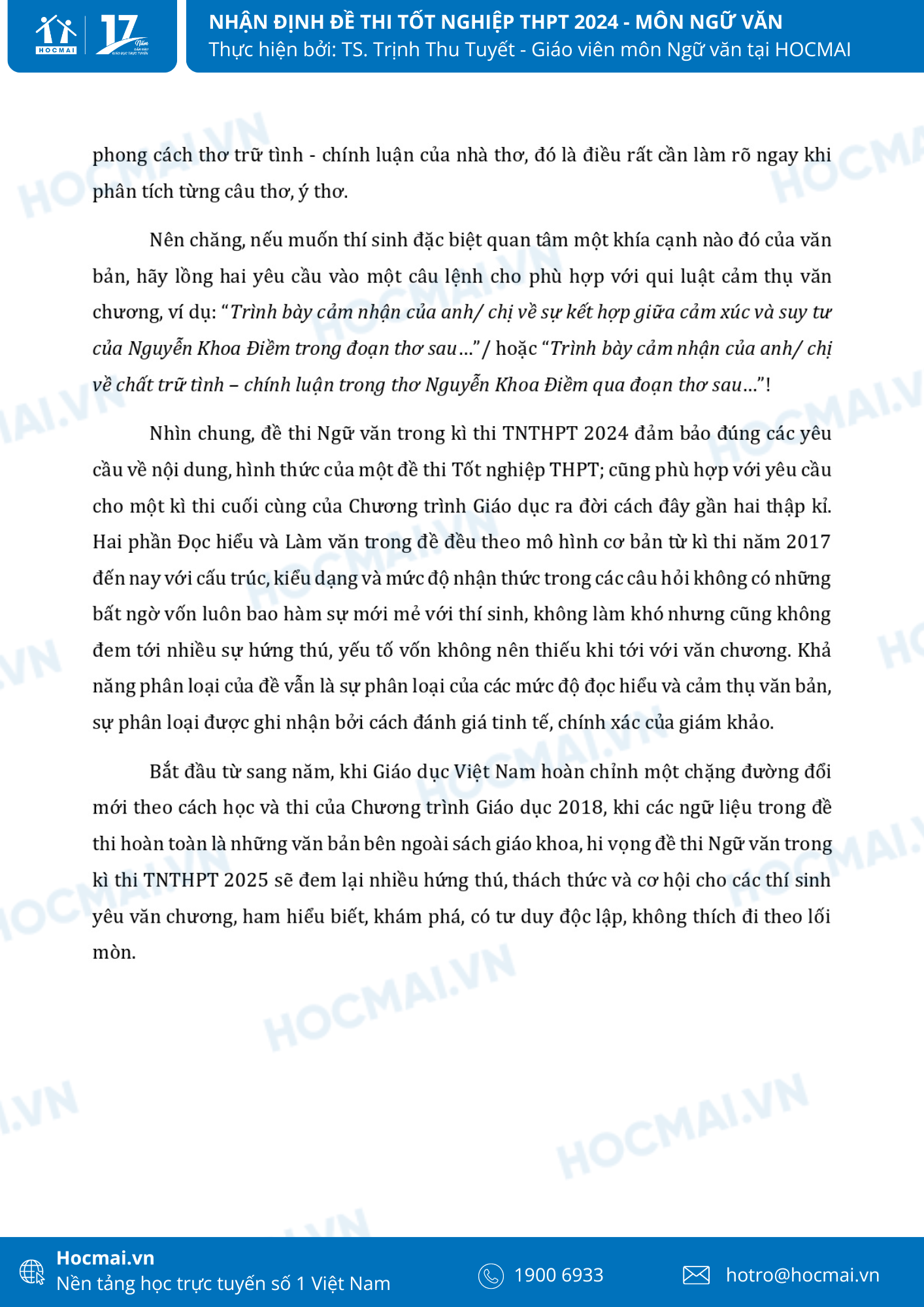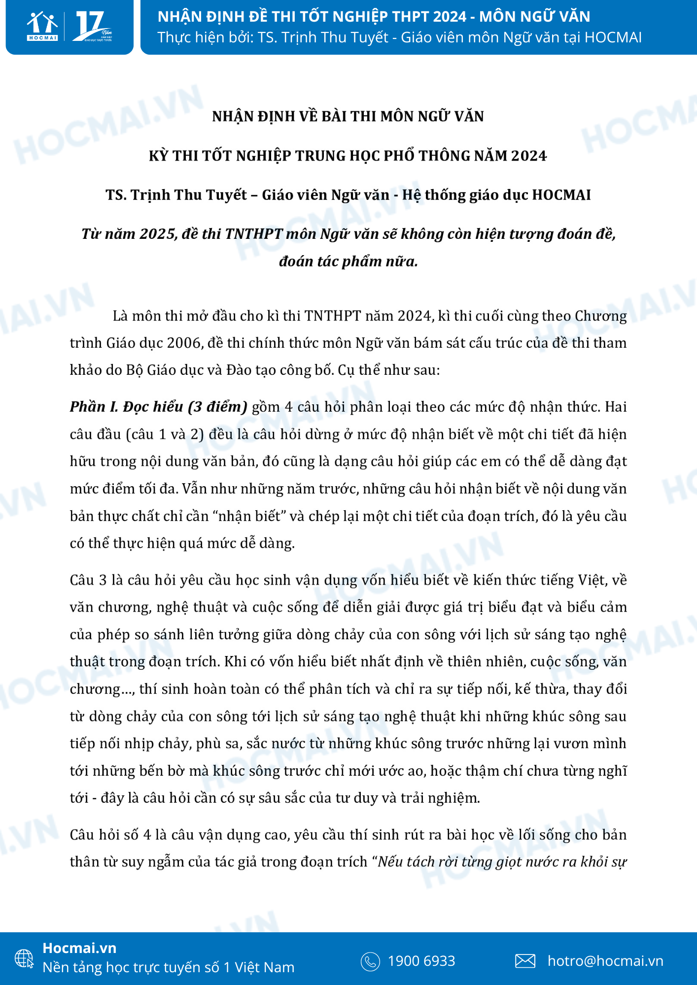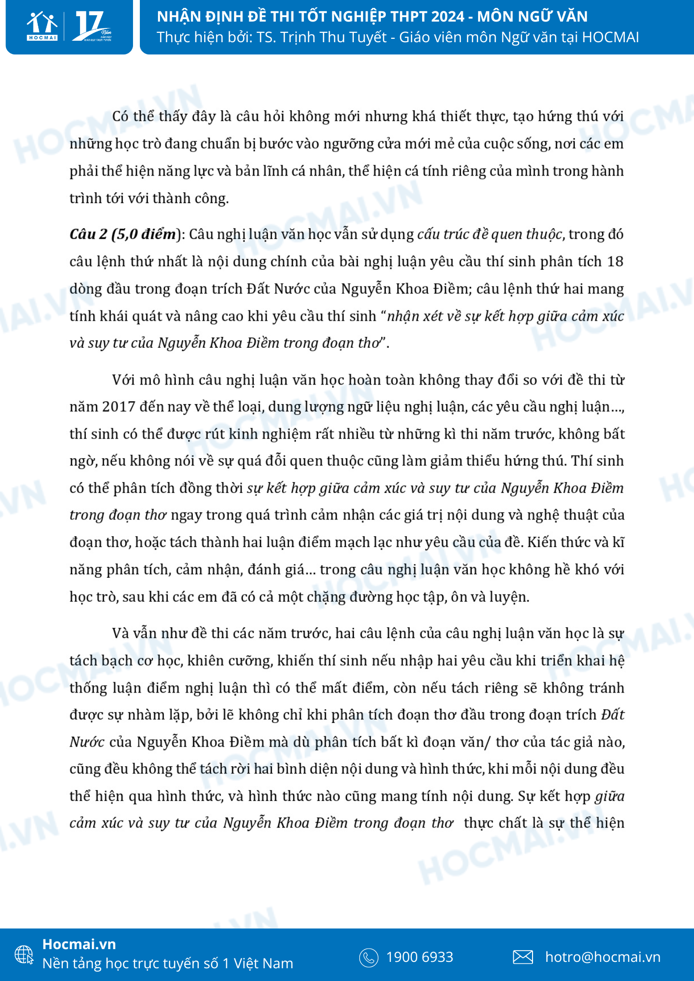 Sau những chuỗi ngày ôn thi miệt mài, sáng 27/6 hơn 1 triệu sĩ tử sẽ bước vào môn thi đầu tiên của kỳ thi Tốt nghiệp THPT Quốc gia với nhiều cảm xúc. Phụ huynh, học sinh hãy cùng theo dõi những nhận định phân tích đề Ngữ văn năm nay cùng với các giáo viên tại hệ thống giáo dục HOCMAI nhé: