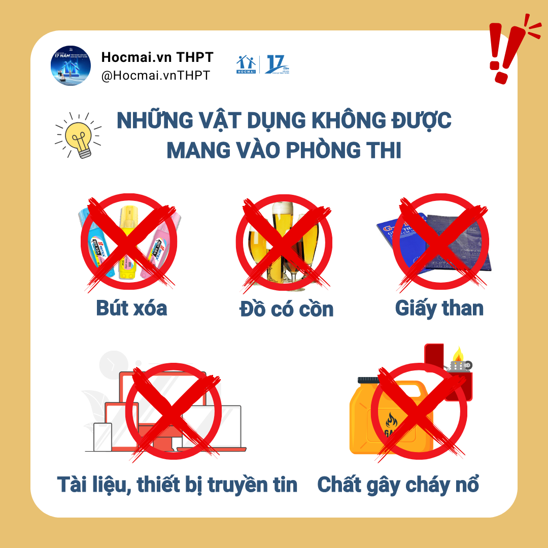 Những vật dụng cấm mang vào phòng thi: Giấy than; bút xóa; đồ uống có cồn; vũ khí và chất gây nổ, gây cháy, tài liệu, thiết bị truyền tin (thu, phát sóng thông tin, ghi âm, ghi hình) hoặc chứa thông tin để gian lận trong quá trình làm bài thi.