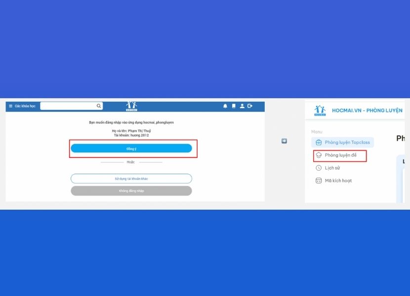 Chọn “Đồng ý” để xác nhận quyền truy cập, sau đó vào mục “Phòng luyện đề” trên thanh menu chính.