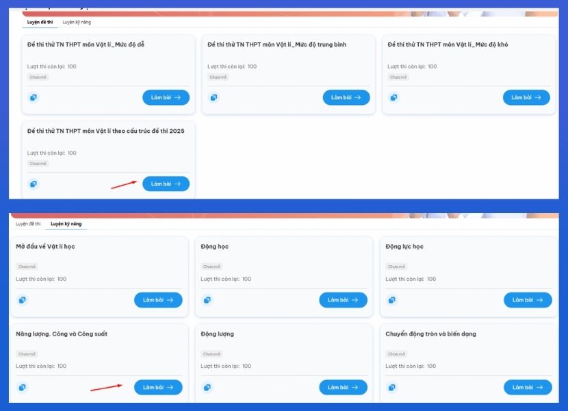 Chọn đề mong muốn trong mục “Luyện đề thi” hoặc “Luyện kỹ năng”, sau đó nhấn “Bắt đầu” để vào bài luyện.