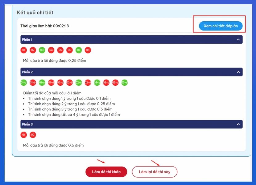 Sau khi hoàn thành, chọn “Nộp bài” để hệ thống tự động chấm điểm. Kết quả sẽ hiển thị chi tiết: số câu đúng/sai, điểm tổng, đáp án, cùng hướng dẫn giải giúp học sinh dễ dàng đánh giá năng lực, nhận diện điểm mạnh – yếu và theo dõi tiến bộ qua từng lần luyện tập.