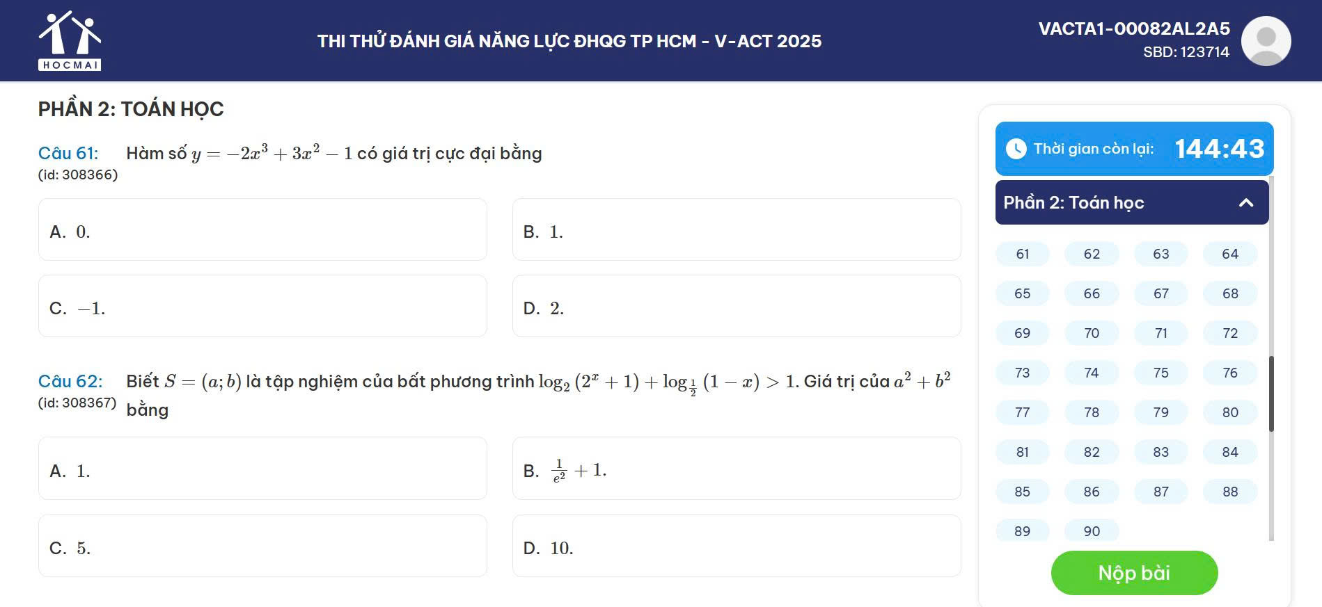 Phòng luyện đề V-ACT HOCMAI là hệ thống luyện thi trực tuyến được xây dựng nhằm giúp học sinh lớp 11-12 làm quen với cấu trúc, nội dung và hình thức của kỳ thi Đánh giá năng lực HCM (V-ACT). Hệ thống mô phỏng tới 99% giao diện và tính năng của bài thi thật, mang đến cho học sinh trải nghiệm luyện thi sát nhất với môi trường thi chính thức.